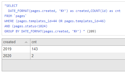db($owners->columns->get('age'));As an example we will create a list of the count of cats and dogs related to their page-creation day. We start with a simple list of all ids of cats and dogs.