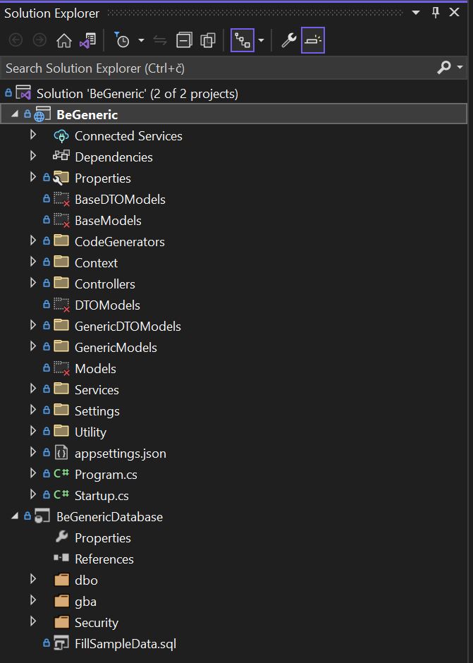 - The solution contained two projects just like on the image below. In the solution, we corrected connection string in both appsettings.json and appsettings.development.json to point to the previously deployed empty database
