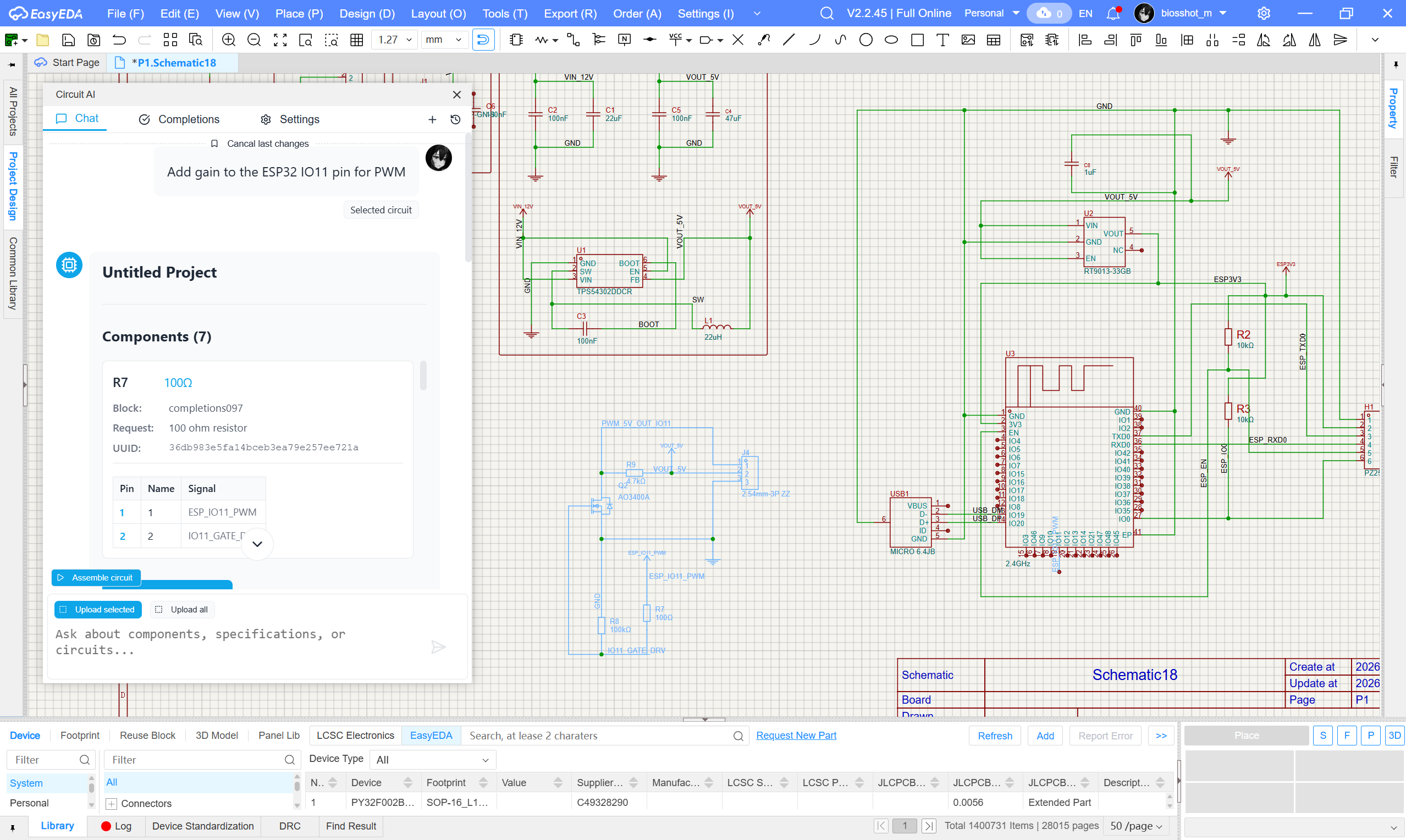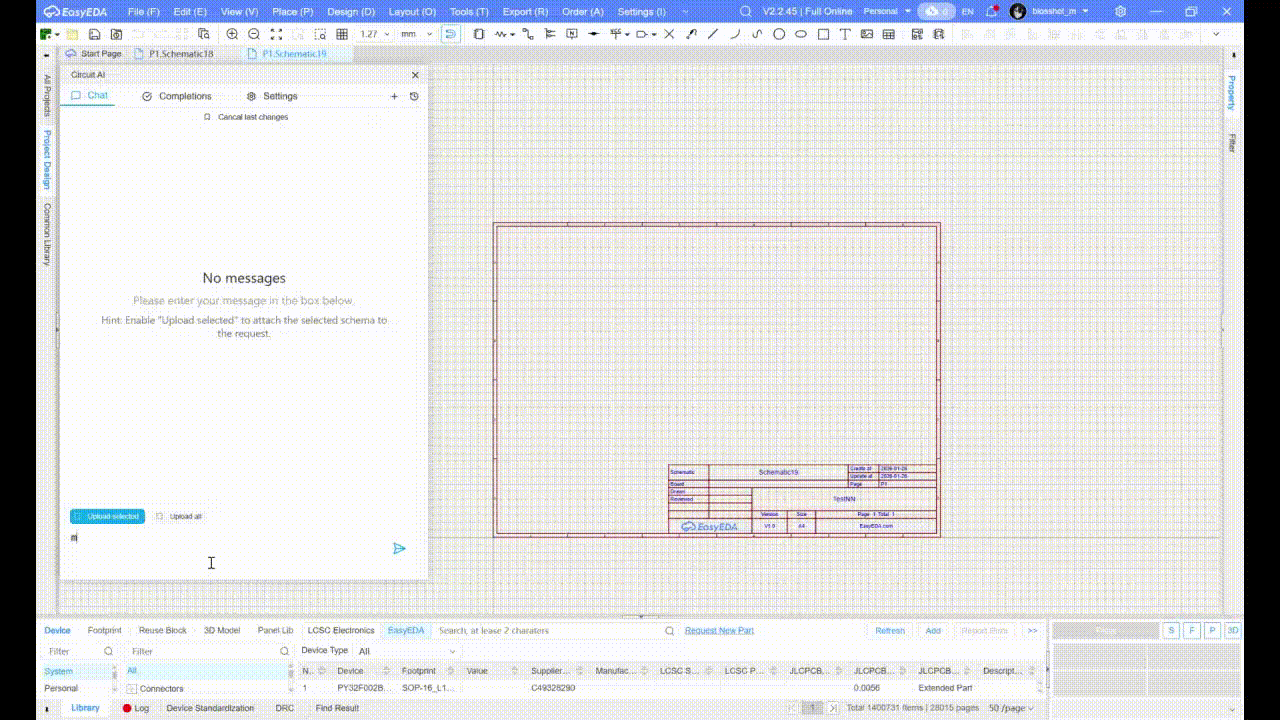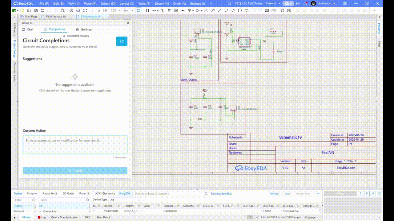 EasyEda Copilot is an AI-powered extension for EasyEDA that improves the circuit design workflow with intelligent assistance. This extension provides AI-powered schematic creation tools and interactive chat features to assist you with your electronic design projects.