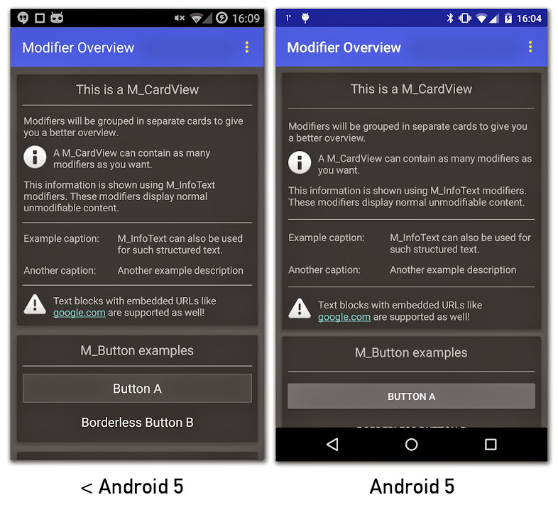 The following code snippet shows a basic example of a created controller which can interact with the user and which generates the UI shown in the screenshot below. Four controller elements are added to a composite container called M_Container. This container is then passed to SimpleUI activity to be displayed to the user. The modifiers like M_Checkbox and M_Button are abstract classes and use the template method pattern to pass down events like the onClick-event for the button or the save event for the checkbox.