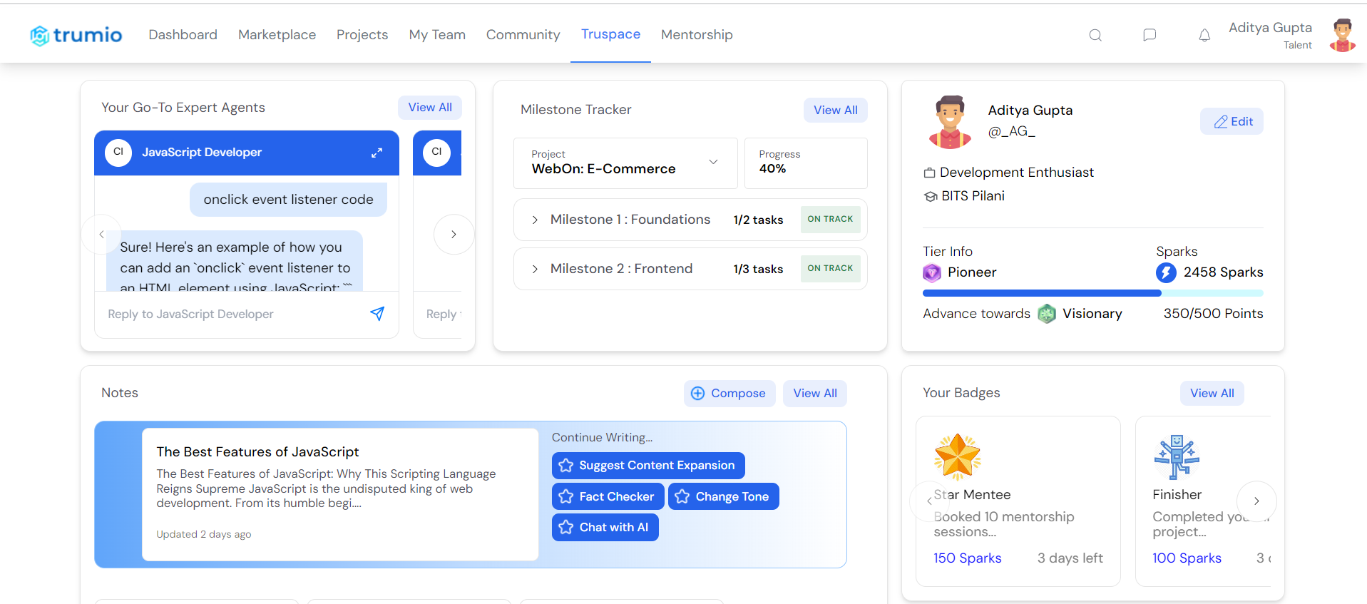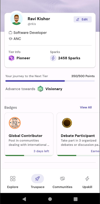 Gamification: Users earn badges and sparks for their activity and achievements, and compete on the leaderboard for recognition. Tiers will be displayed on the student’s profile and will help clients become aware of their skill level.