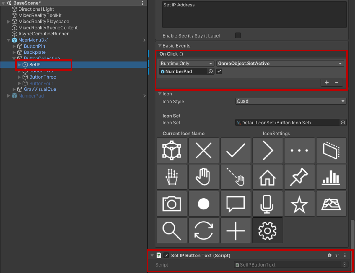 Then go to the NearMenu3x1 game object and navigate to SetIP. In there, add the SetIPButtonText script (which should already be there). Then at Basic Events, add an On Click() event and add the NumberPad game object. Then click on the GameObject.SetActive function and make sure the box is checked below it.