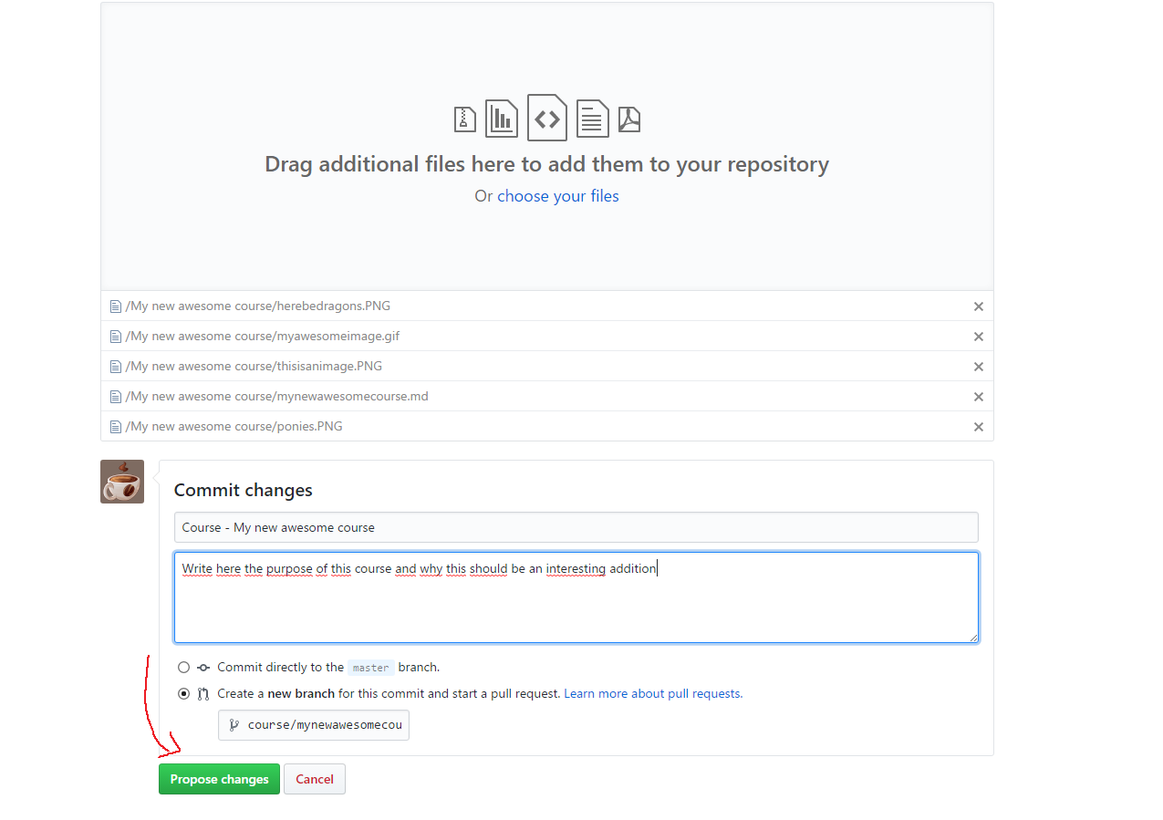 course/mycoursename - Click on Create pull request and you're done! We will review your submission as soon as we can.