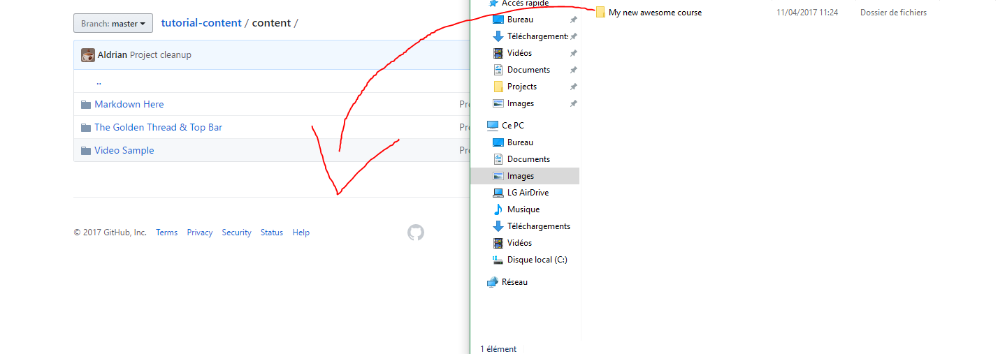 - Create a folder that matches the title of your course containing the markdown files and your images (if you have any) and drag it into the github window