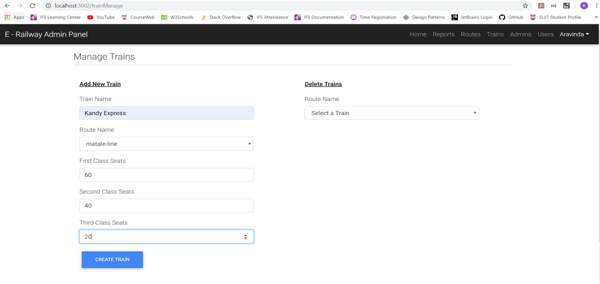In the original design they haven’t mentioned that railway transportation administration should manage trains through the system but as an added feature we have also created an interface to manage trains using unique train name and assign the seats in the different classes of that train and assign the route in which the train will operate. Following are functionalities available in the Train Management for railway transportation administration.