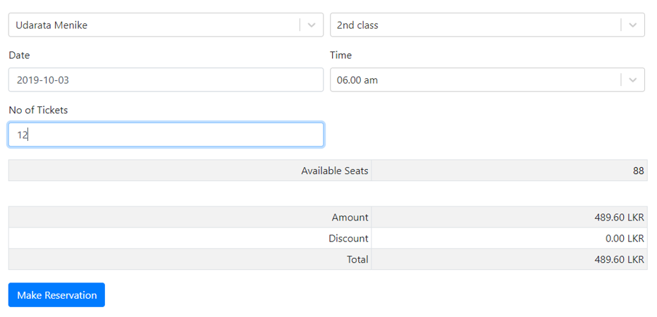 In this application users can provide the reservation details and check the current availability of seats and make the booking. Our application tracks the reservations made before and displays the actual seats available at the time user going to make a reservation. When make booking user needs to add start and the destination locations, train, class, time, ticket quantity and the date of booking. Once the data entered the application get the previous bookings for same train’s time and date and subtract by the number of seats that train has.