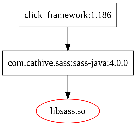I noticed that com.clickntap:click_framework:1.186 directly depends on com.cathive.sass:sass-java:4.0.0. As shown in the following dependency graph. However, com.cathive.sass:sass-java:4.0.0 sufferes from the vulnerabilites which the C library libsass(version:3.3.6) exposed, containing the following 13 CVEs: