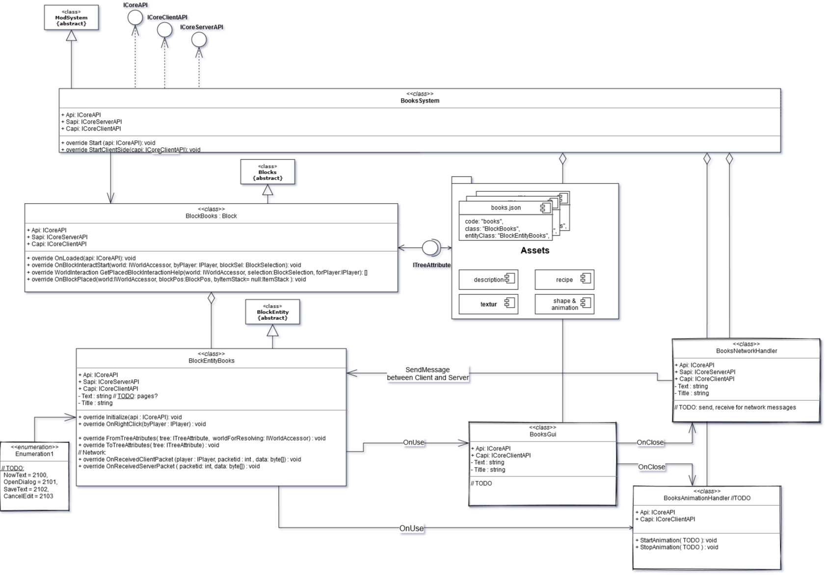 modbooks features books in various colors to be crafted in order to give players the ability to share information. In order to do so players need to craft paper, ink, quill, inkwell and pencils thus learning about how humankind discovered and made iron based ink and pencils. After crafting all the parts for the book and mixing up various chemicals in barrels players can start to share books and papers with information they wrote.