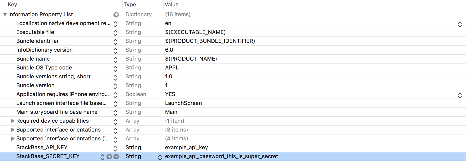 Once you have properly installed StackBase, open up your main info.plist file. Add values for the following keys: Stackbase_API_KEY and StackBase_SECRET_KEY