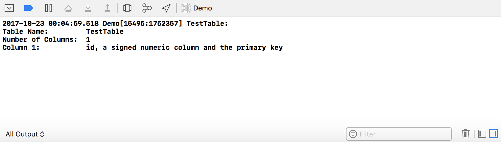 }];We already have a numeric column (id), so we should give this table a text column. Before we can do that, we need to add a property to our code. Put the following to your .h file: