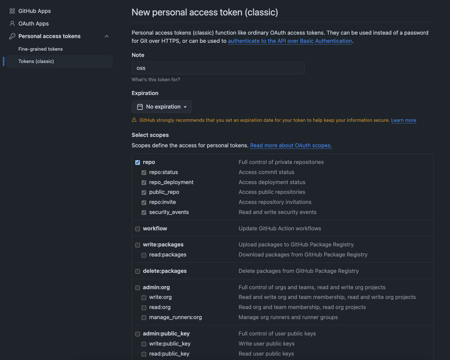 点击 token 获取链接,权限需要勾选 repo 和 user: