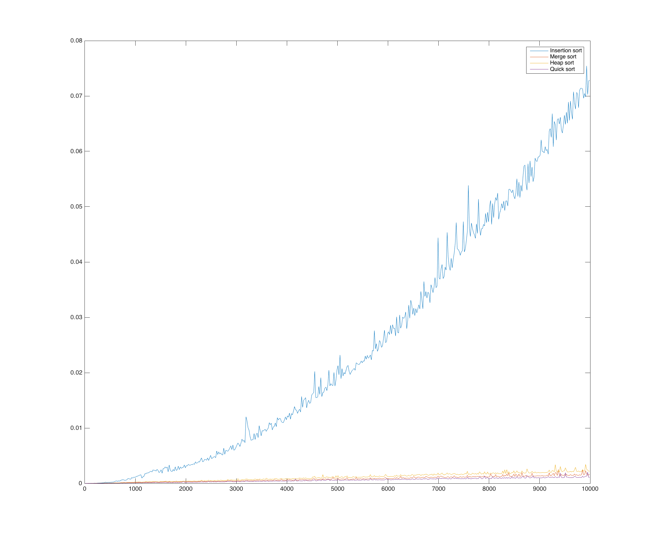 Insertion sort is a sorting algorithm efficient when the input is small, in fact the growth of the computation time is proportional to the square of the input length: T(n)=𝛩(n^2) where n is the length of the input array.