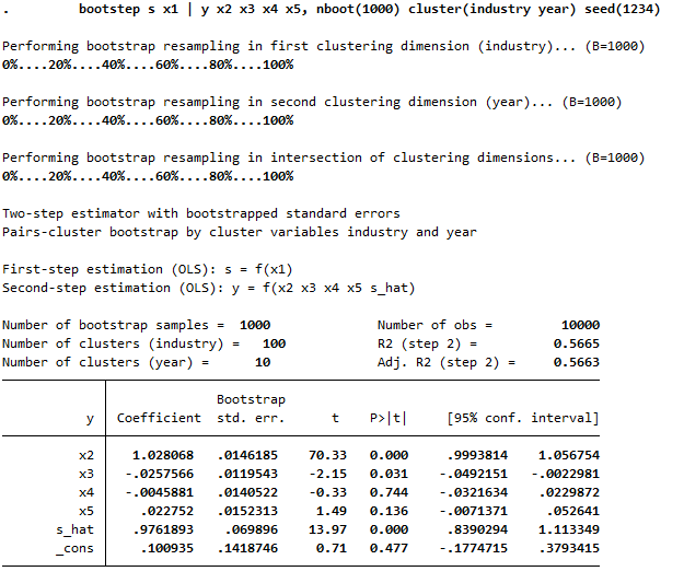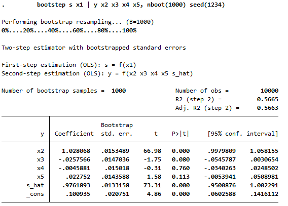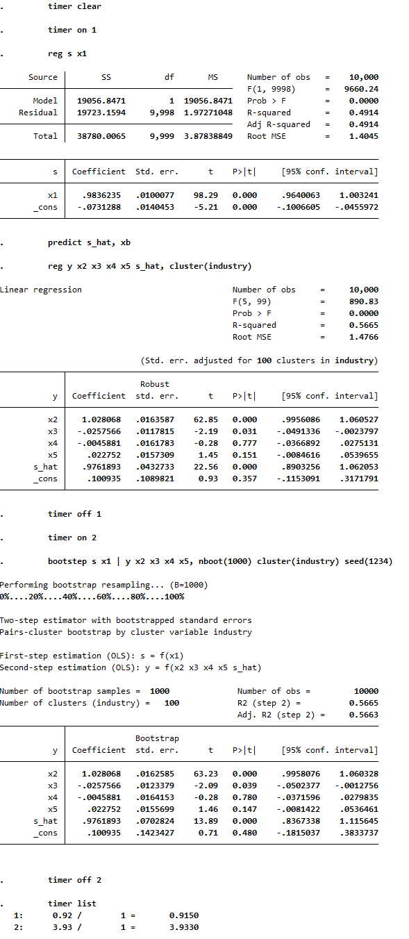 The following example shows how the program can be run and how fast it is (the program can be tested using the test_bootstep.do file). In the second-step OLS estimation with basic standard errors, the standard error of the coefficient on s_hat is too low and t-stat is too high compared to the unbiased bootstrap estimate. The screenshot also illustrates how performing 1000 bootstrap replications takes only about 4 seconds in this example: