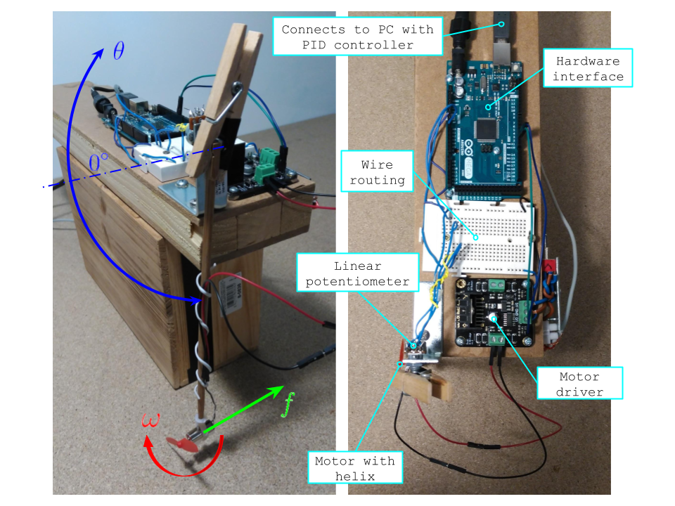 It is worth to note that, in our scenario, there is a free joint (the one with the potentiometer) and an actuated joint (the one with the motor/helix couple), from the URDF point of view. Thus, if one takes a look of the controller configuration there are two controllers that basically forward commands, and this is because in the ROS controls project there is no way to set such scenario for a PID control.