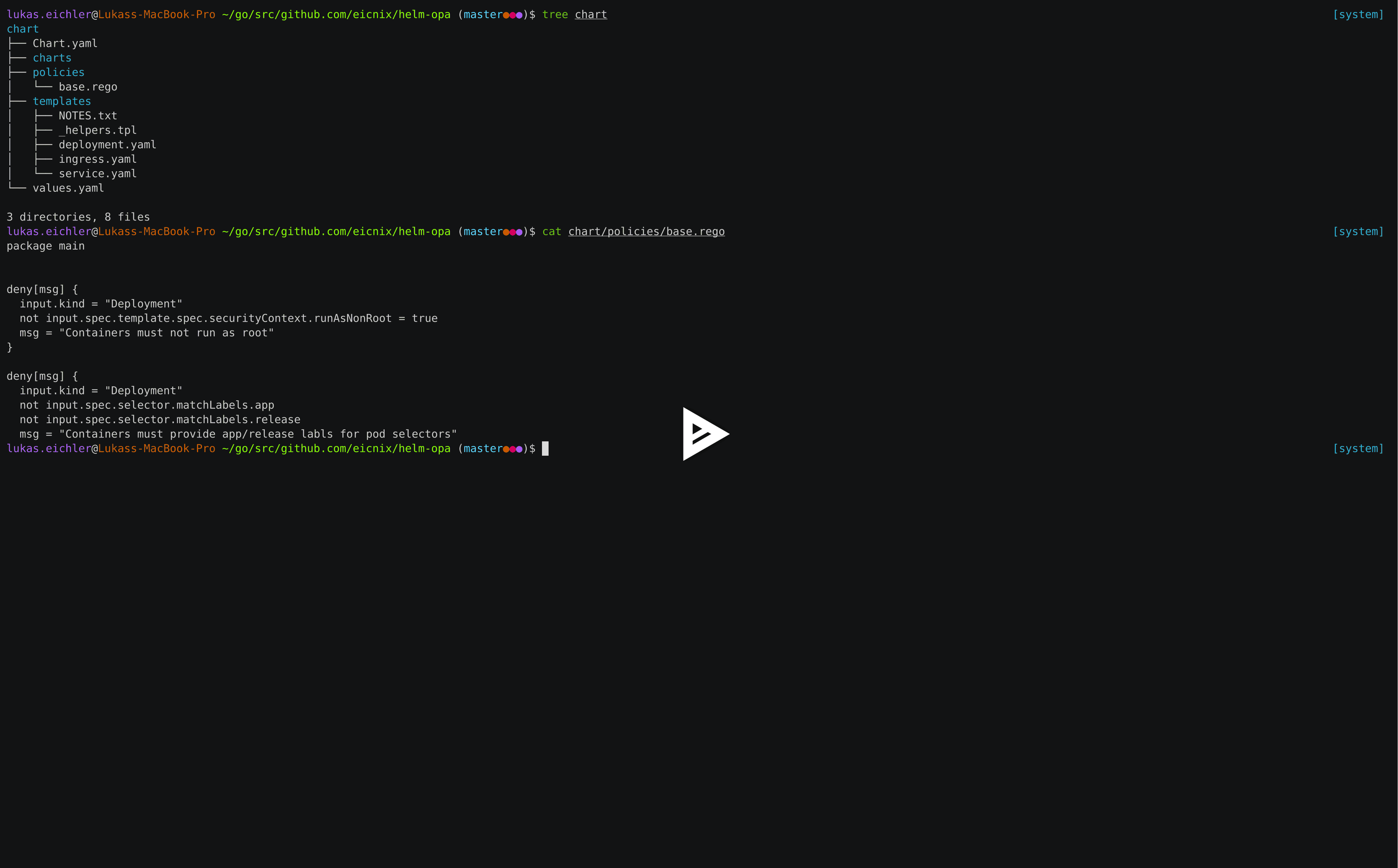 Result: Chart is not compliant$ helm plugin install https://github.com/eicnix/helm-opaCopyright 2018 Lukas Eichler