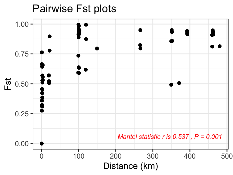 - tests the significance of the association between FST and distance using mantel test