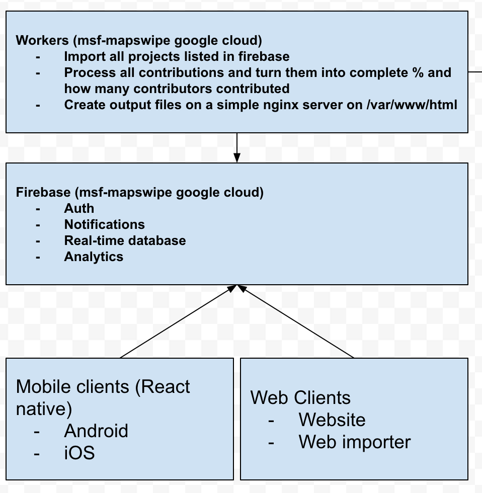 - Our backend workers process those imports and place them on firebase in the /projects reference. It imports them into groups that are safe for the user to cache locally on their phone (ideally 200 tiles). You can see an example of how that grouping works here: