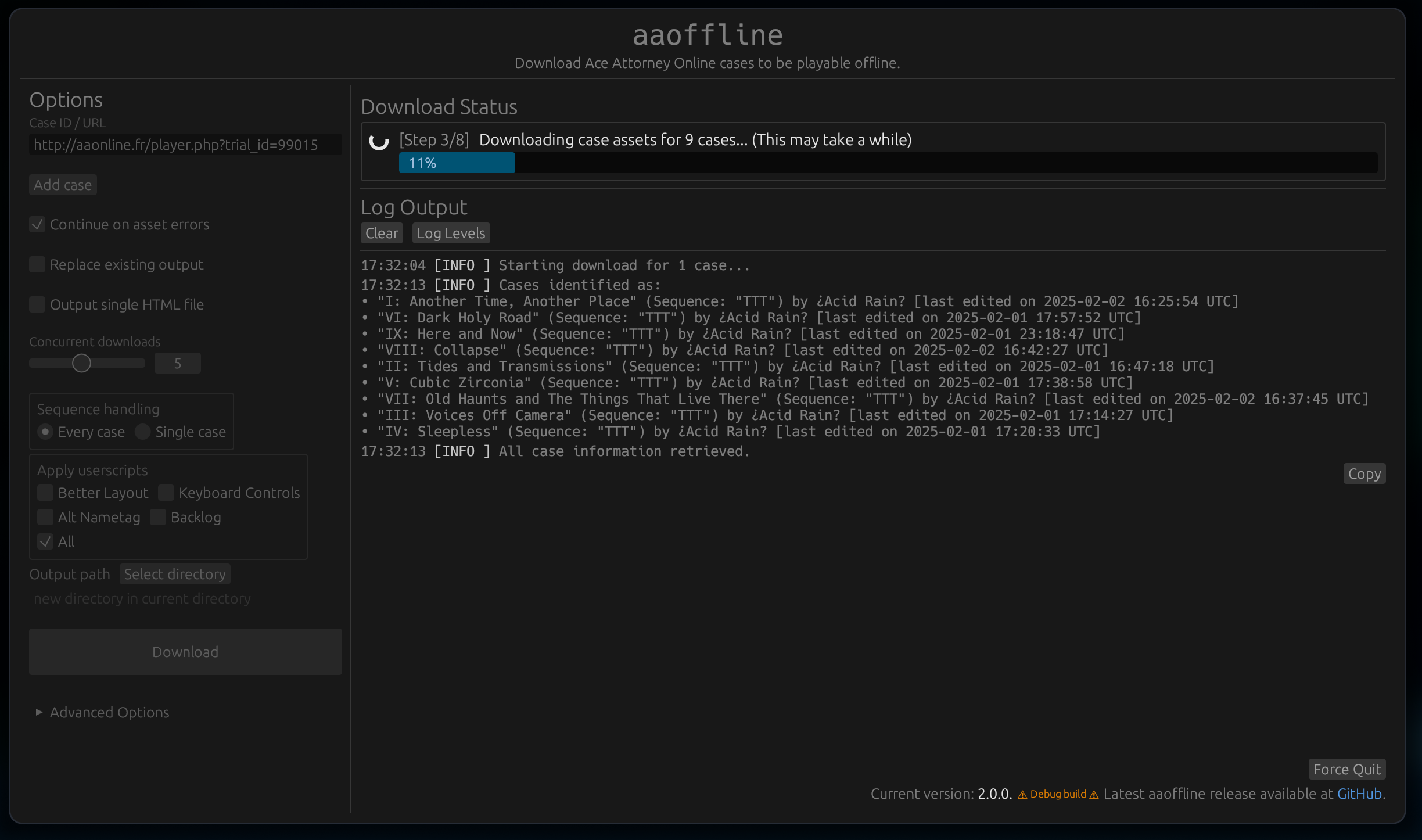 aaoffline-guito configure the download in a GUI instead of a terminal. - Download multiple cases at once.