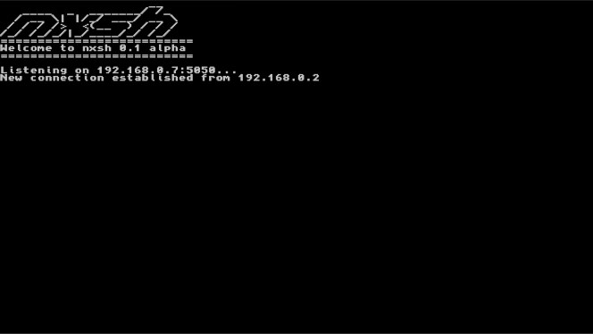 The built-in Windows telnet client does not play nicely with nxsh, so I recommend installing PuTTY. Note that connecting via a "raw" connection instead of a "telnet" one will avoid a pesky "command not found" message upon initialization of the shell. The telnet protocol sends some garbage text as it's negotiating the connection, so if you want a clean-looking shell, ditch that and go for a raw socket.