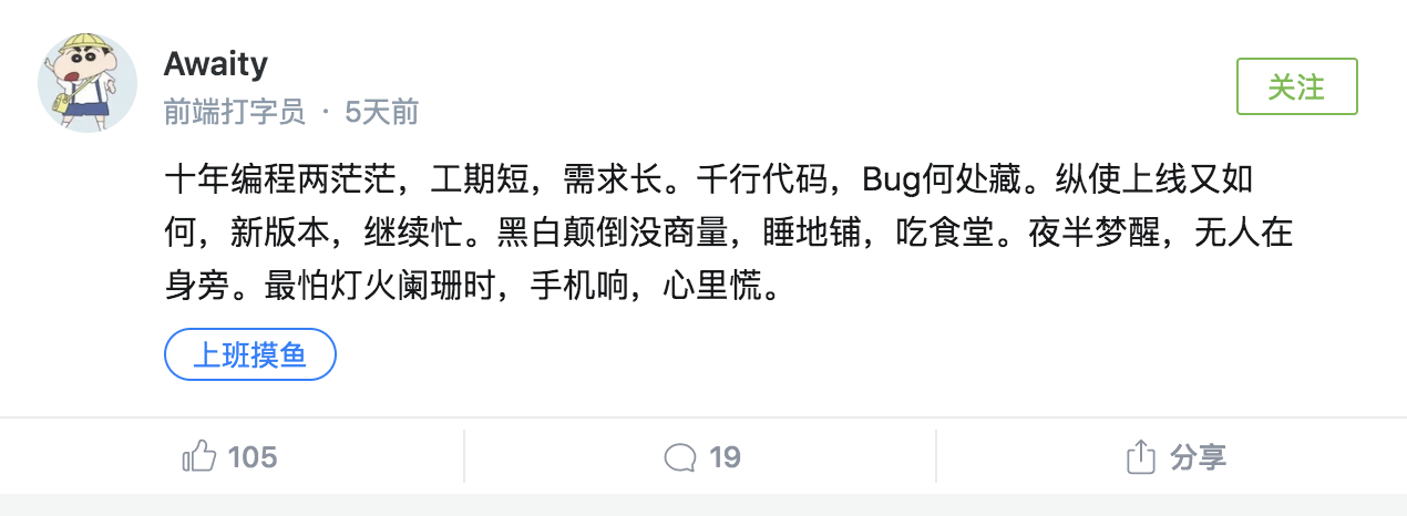 ### 有趣的事 #### 好诗 <img width="635" alt="hello 2019-07-26 at 2 41 04 PM" src="https://user-images.githubusercontent.com/42405899/61931537-6e892800-afb3-11e9-8932-1588345b2320.png"> https://juejin.im/pin/5d32f54251882564daa2ea5c
