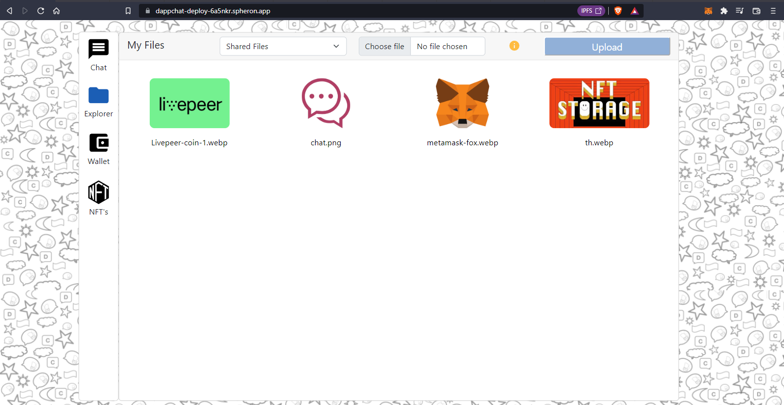 In the case of the explorer, the use of Chainsafe is essential, since with this we can obtain the CID of the contents that we have uploaded to chainsafe from our chat and, in turn, the files that we have uploaded from the explorer.