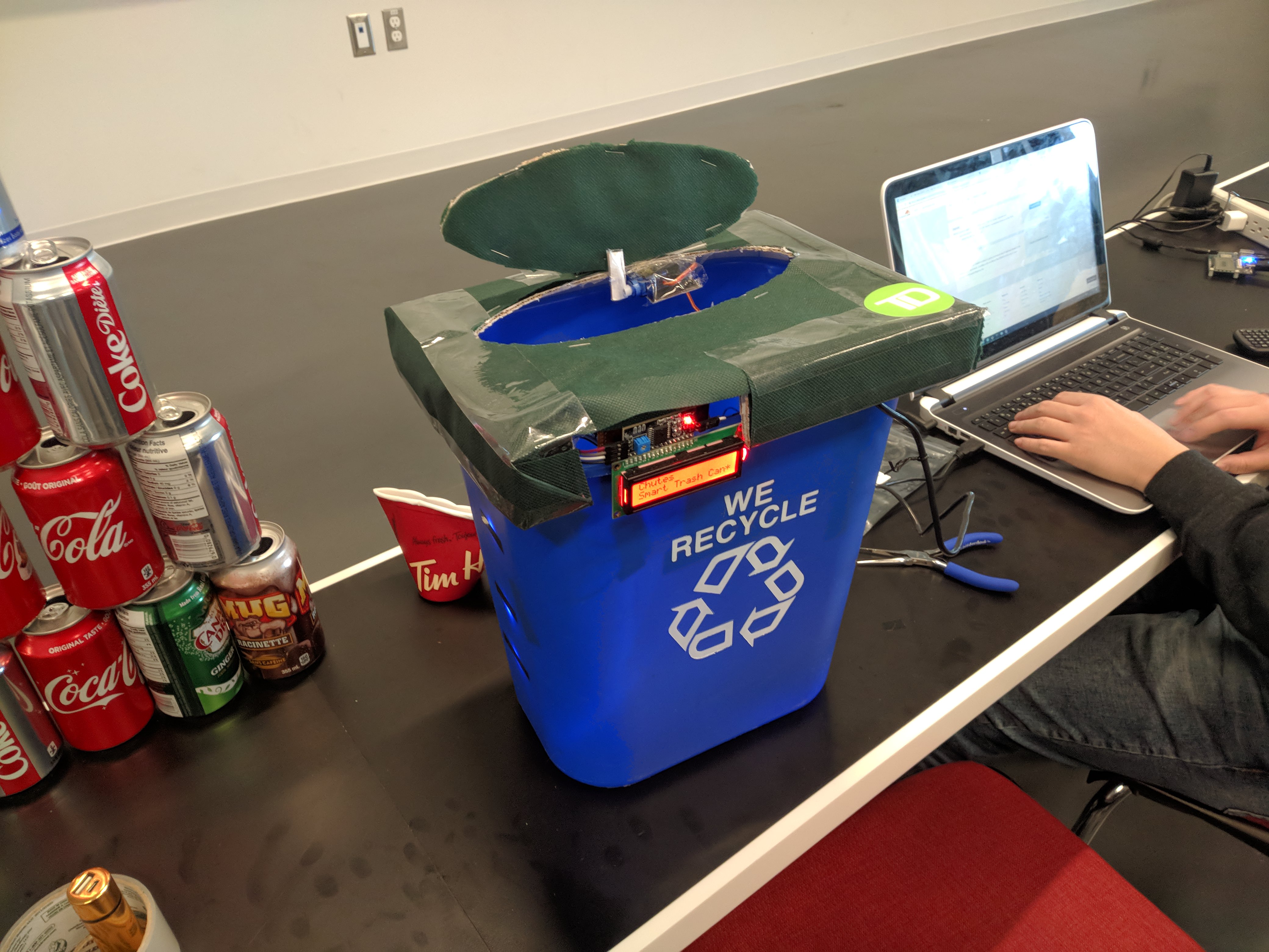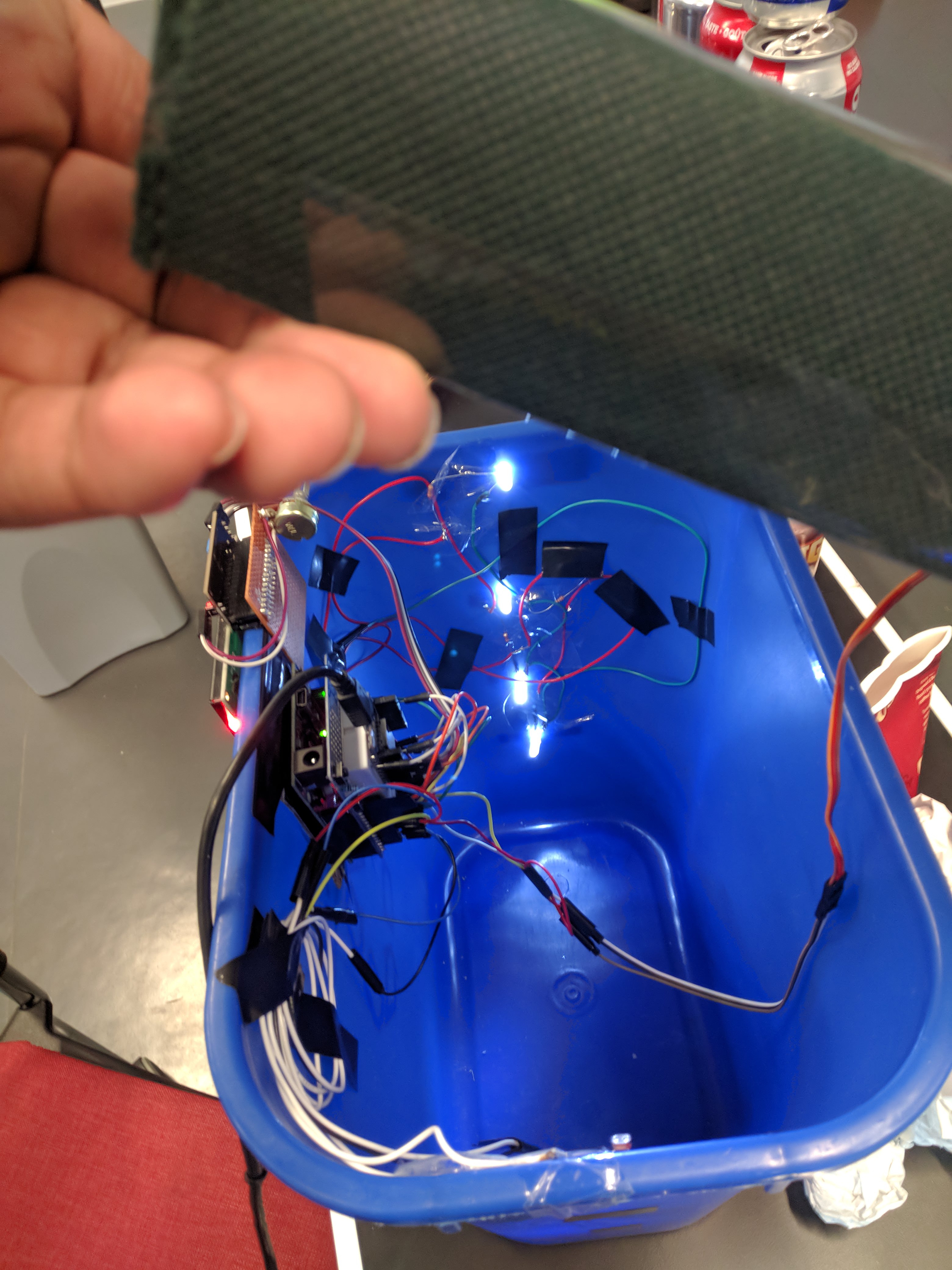A smart garbage can that detects when the bin is full using sensors powered buy an Arduino. When light sensors detect that bin is full, close the lid using an attached motor. Send a notification to all users of the iOS app who are currently accepting jobs. Allow available users to view the details of the full bin and accept or decline the job. Jobs are assigned on a first-come, first-served basis. The user that accepted the job will have the ability to re-open the garbage bin through the app, and will do so to dispose of the garbage. Once the job is completed, the user will receive the agreed upon funds for the job. The user can view valuable data through the app such as environmental statistics, money earned, account details, and more. The iOS app is designed with a highly usable UI for both aesthetics and usability. The app has 'community' information to build a sense of greater purpose beyond the monetary gain. The data shown gives an insight on how much the enironment has been aided, how much others have done, and how much the individual has done to help the cause.