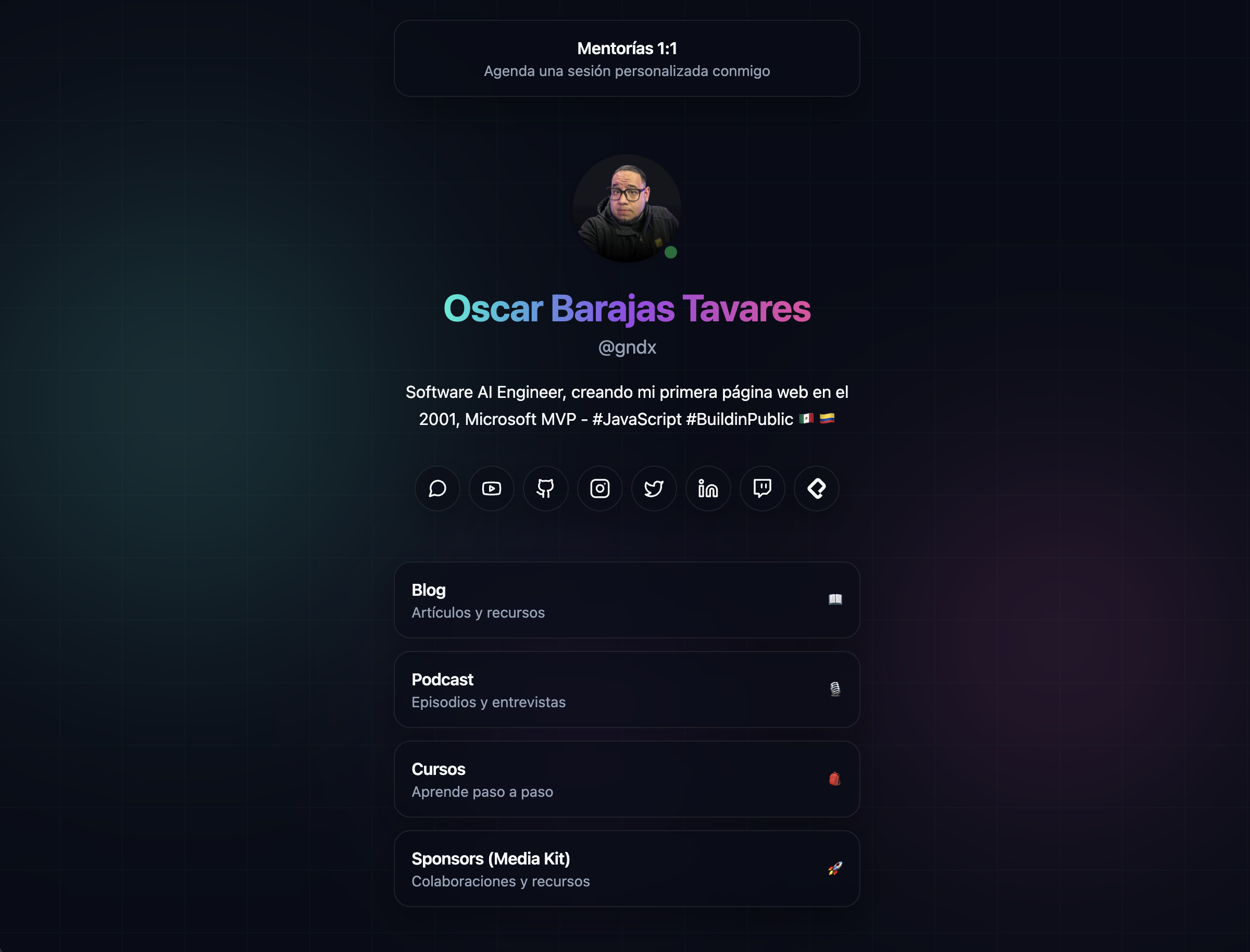 site.seo: title, description, canonical URL, OG image, Twitter cardssite.profile: avatar, name, handle, and biosite.featuredLink: top featured linksite.socialLinks: list of social networks (with embeddediconSvg)site.linkCards: main link cards (title, subtitle, emojis, andhref)