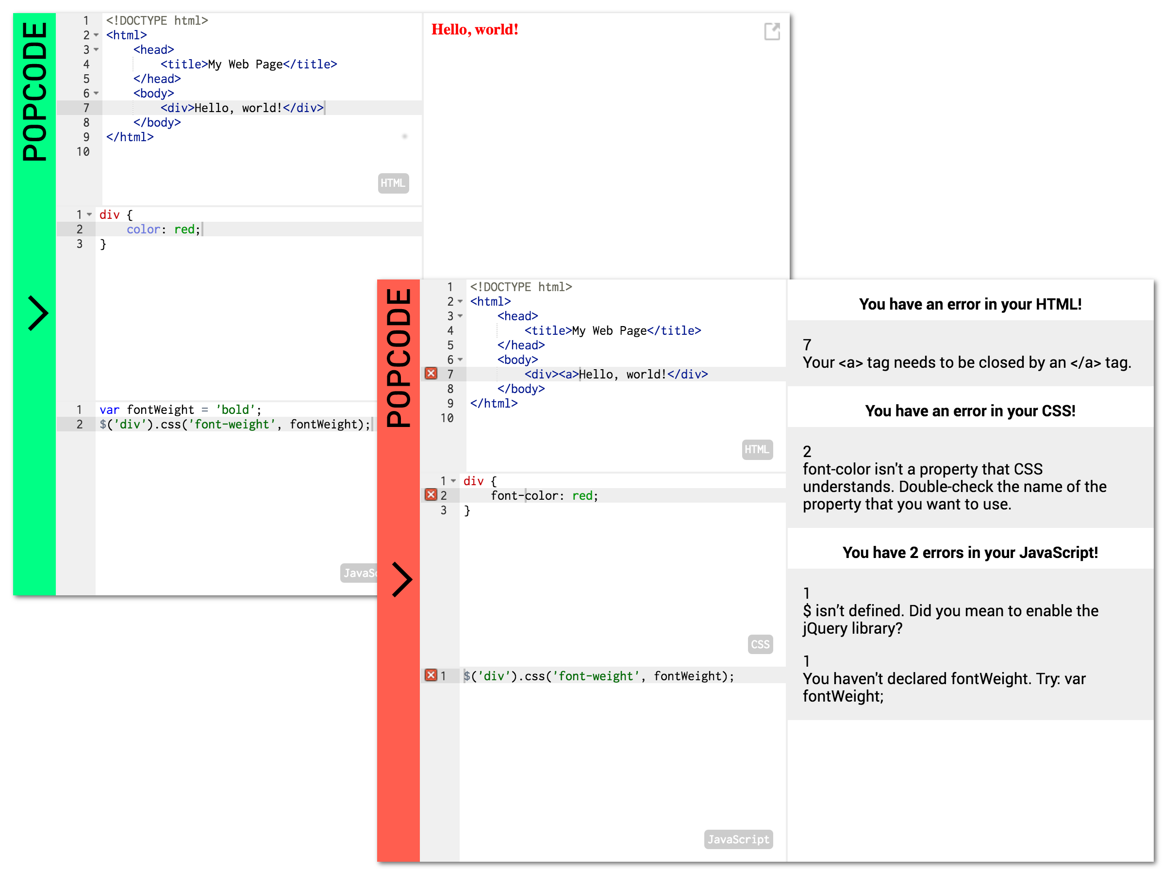 Popcode is a simple HTML/CSS/JavaScript editing environment for use in the classroom. It's a lot like JSBin, JSFiddle, or CodePen, but it focuses on giving specific, immediate, human-friendly feedback when the code contains errors.
