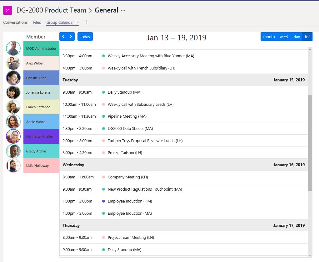 The following sample is a Microsoft Teams tab application that will show a Group Calendar by calling the Microsoft Graph API to get the members of a particular Team, then the getSchedule Graph operation to get the schedule of the users involved. The Display side of the application makes use of the FullCalendar JavaScript event calendar. The legend is built using the users photo which is downloaded from the Graph API also.