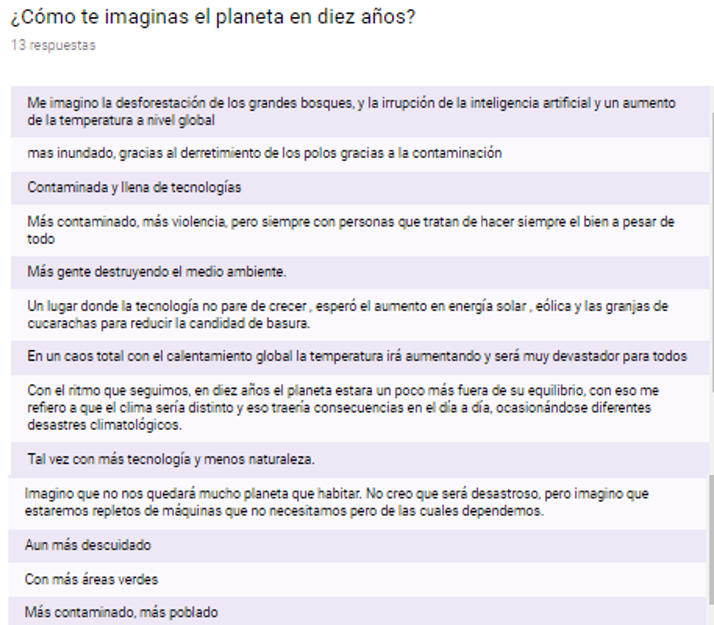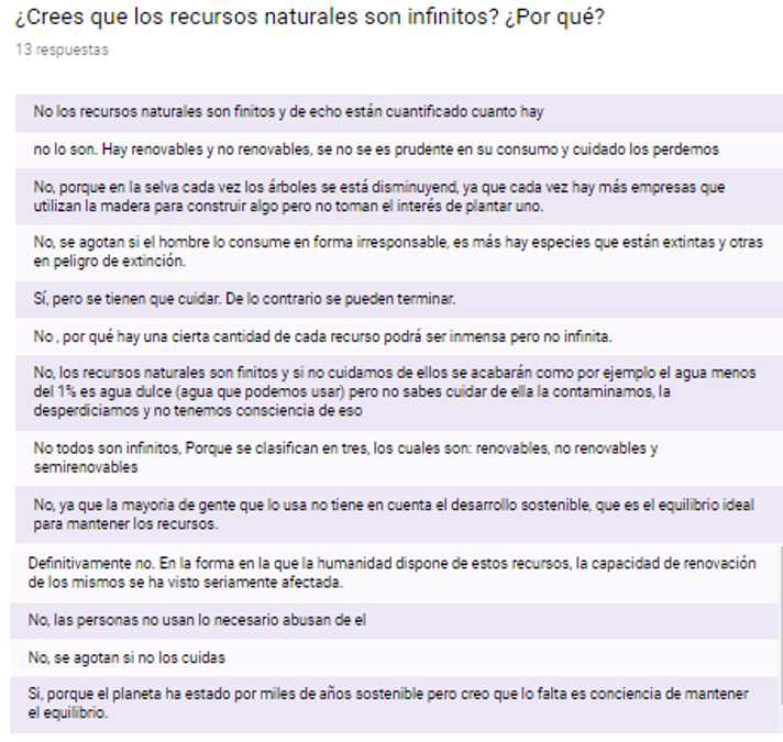 Con las respuestas de las 2 primeras preguntas; podemos ver que la mayoría percibe que el mundo necesita un cambio en sus hábitos con respecto a cómo utilizamos los recursos naturales, ya que si no cambiamos en 10 años el mundo será menos habitable y con menos recursos naturales vitales para sobrevivir.