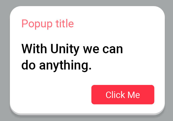 Popup.Show ("Popup title", "With Unity we can do anything.", "Click Me", PopupColor.Red, OnClose);