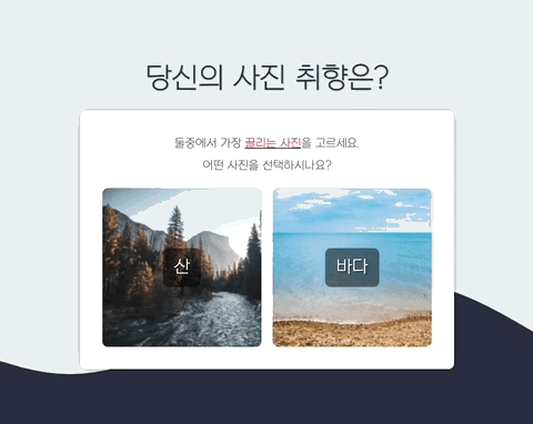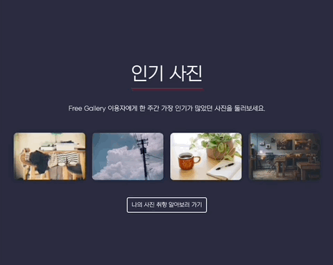 ๋์ ์ฌ์ง ์ทจํฅ ์์๋ณด๋ฌ ๊ฐ๊ธฐ ๋ฒํผ์ ๋๋ฅด๋ฉด ์ ํ์ด์ง๋ก ์ด๋ํ ์ ์๋ค. ํ์ด์ง์์ ์ ์ ๊ฐ ์ฌ์ง์ ํด๋ฆญํ์์ ์, ์์ ์ด ์ด๋ค ์ฌ์ง์ ํด๋ฆญํ์๋ ์ง ์๊ธฐ ์ฝ๊ฒ ํ๊ธฐ ์ํด hover ์์ฑ๊ณผ ์ ๋๋ฉ์ด์ ์ ์ฃผ์๋ค.