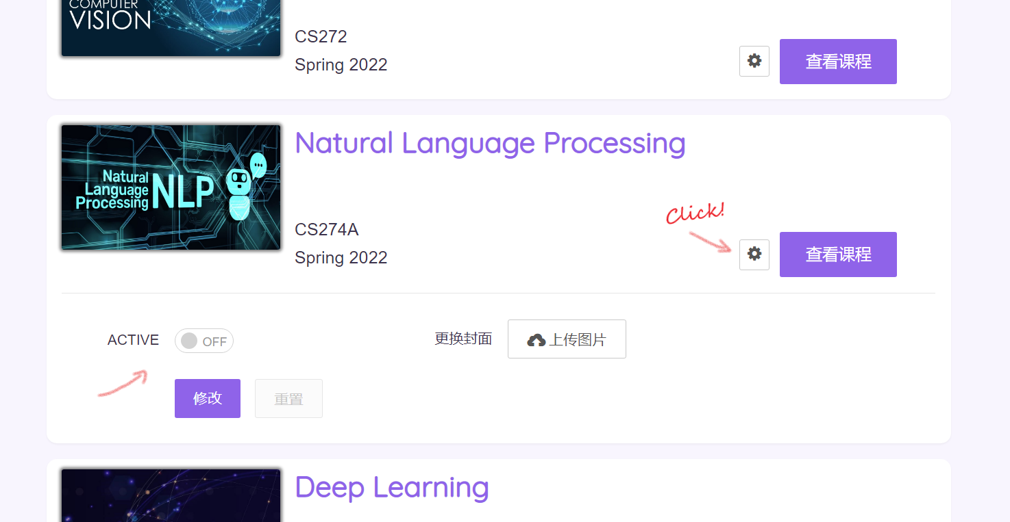 Quite similar to step 4.1! For the semester card you want to edit, click the gear icon on the left of the button '查看主页'. Then fill in the information based on the instructions. However, your modification will NOT render in real-time.