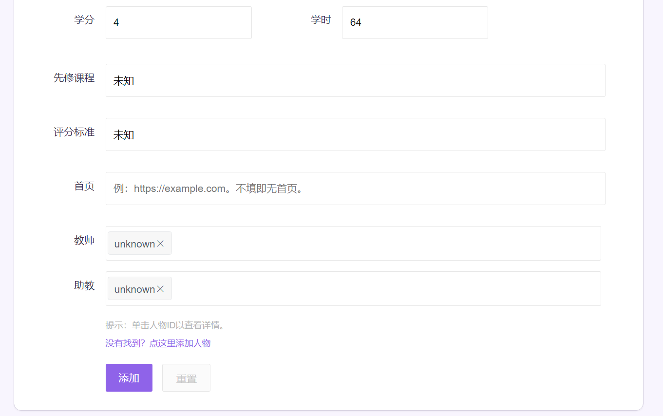 When you're dealing with semesters, you may find that there are people not in the database. Click '没有找到?点这里添加人物' to add new people.