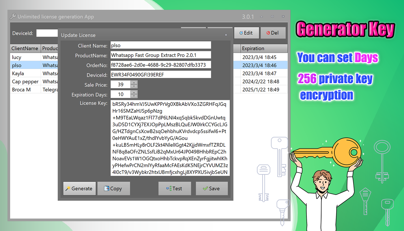 unlimited License:It can help you quickly and easily generate unlimited License Key authorization files, and you can sell them to as many customers as you want.