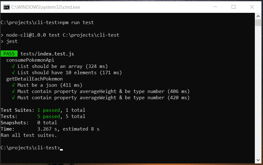 Node CLI Test A simple Test Install npm i npm link CLI Comands GetListPokemon --limit 100 --offset 200 Extra GetListPokemon --type 1 Test npm run test