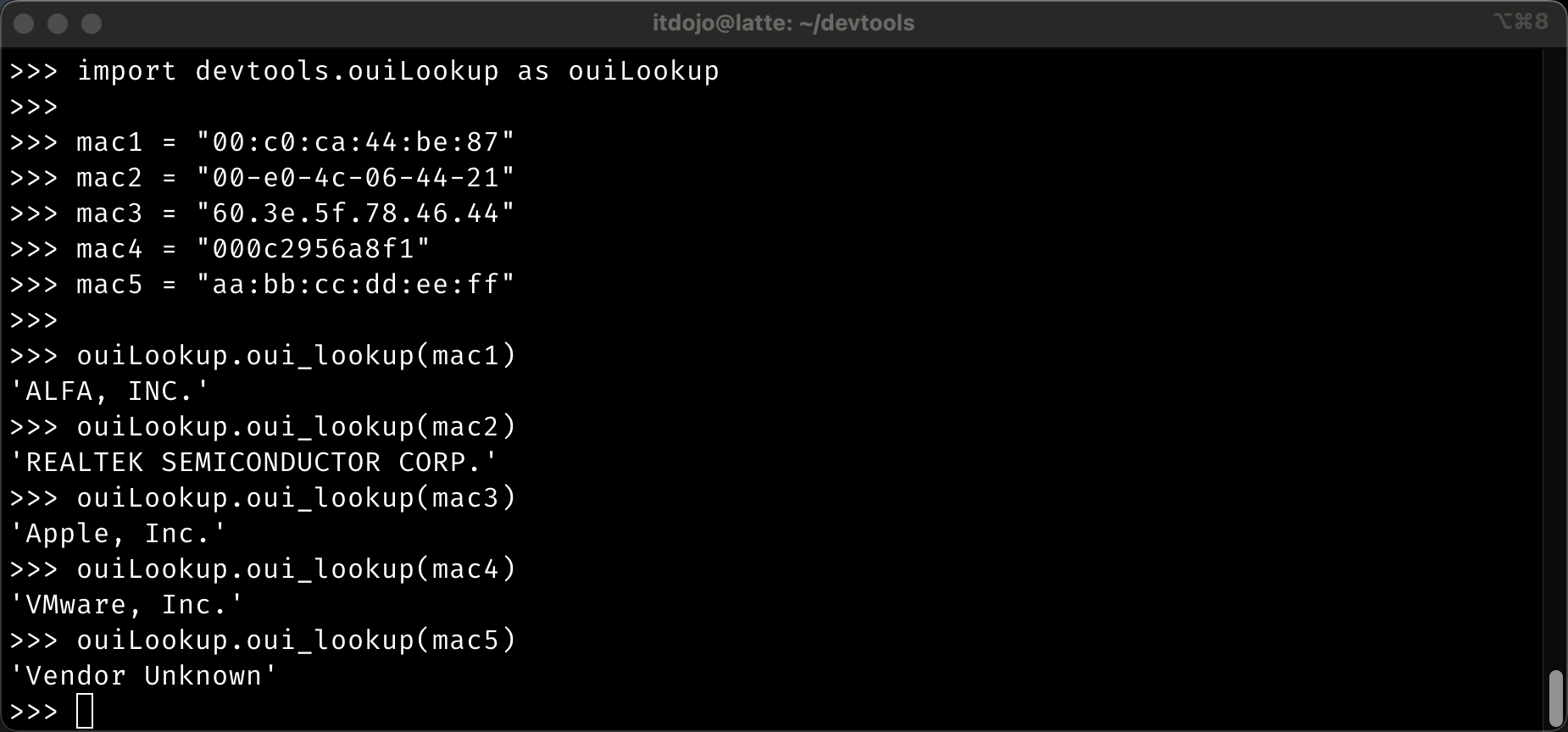 'AA:BB:CC:11:22:33'ouiLookup