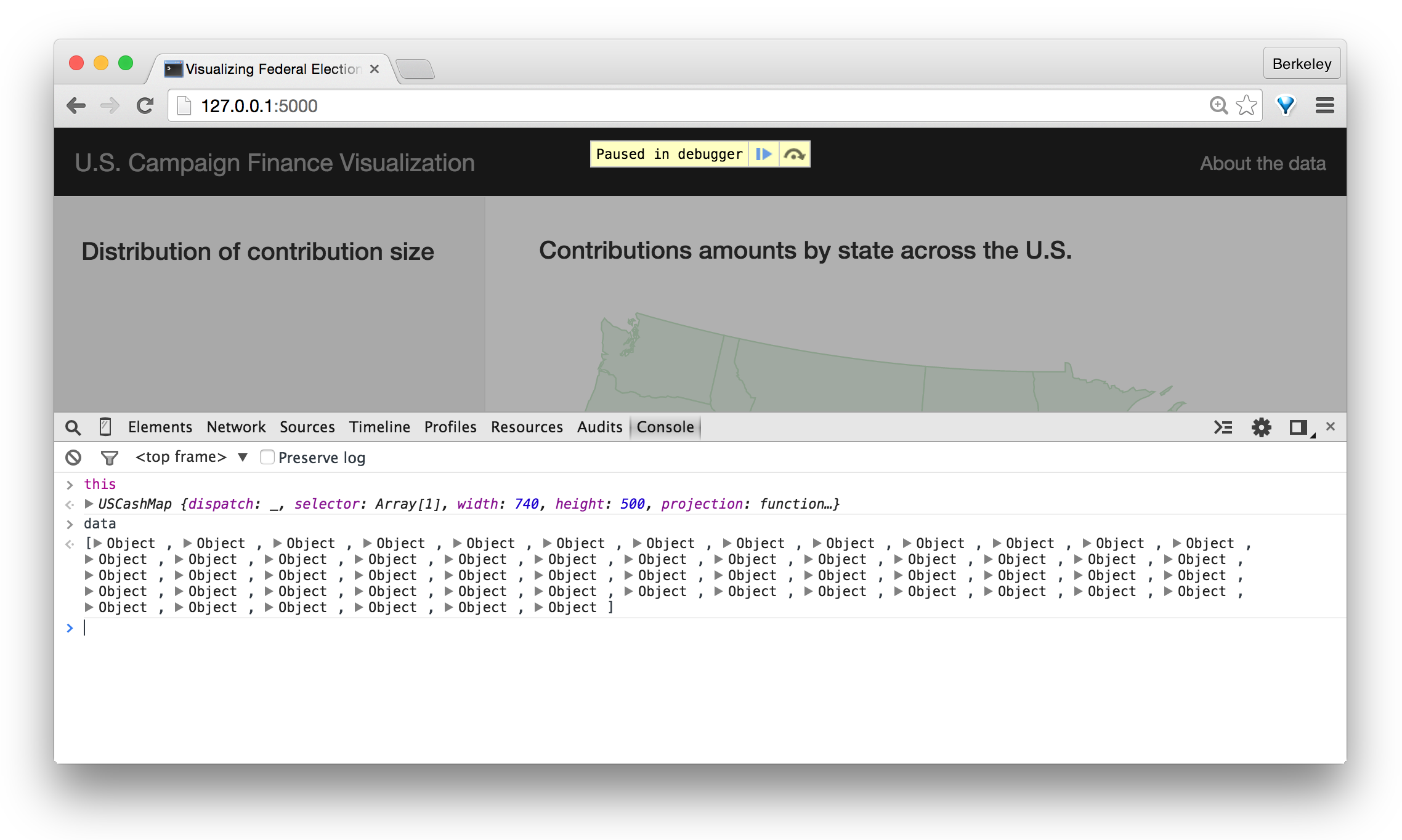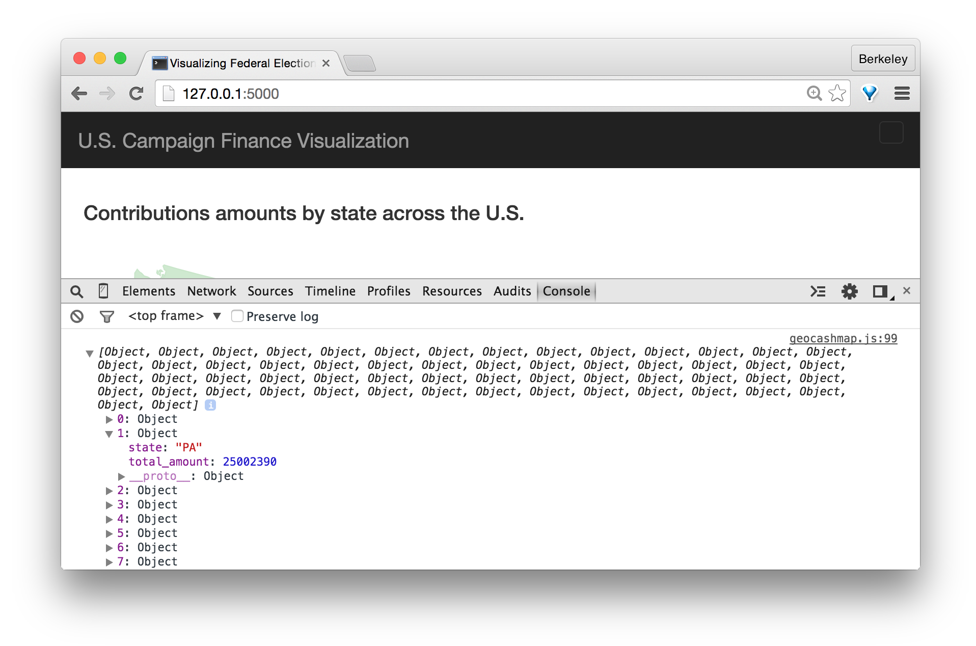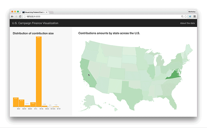In homework 3, we wrote SQL queries that helped us answer certain questions about campaign contribution data in the United States. However, with a large number of results, it's hard to make heads or tails of what the data actually means. In this project, we'll explore using D3.js to help us visualize trends and significance in our data.
