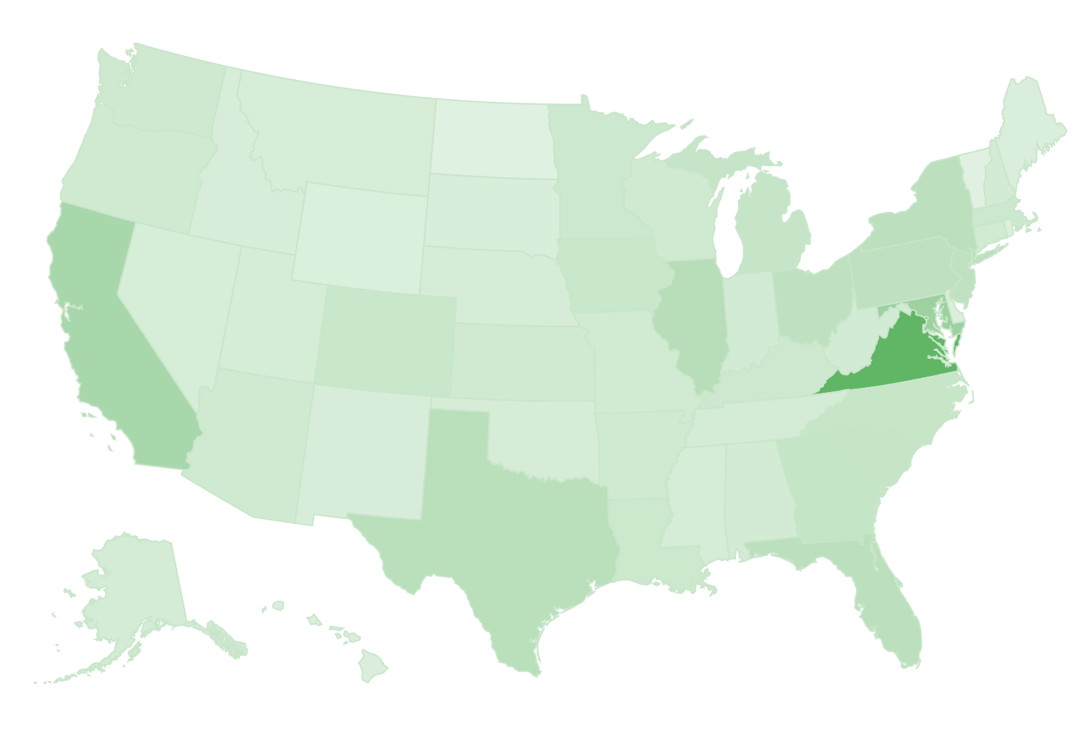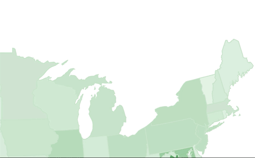 Begin by making meaning out of the total contribution amounts by coloring the the individual states (line 118) without handling any user events. When you've got this part down, your map should look like the colored map pictured above.