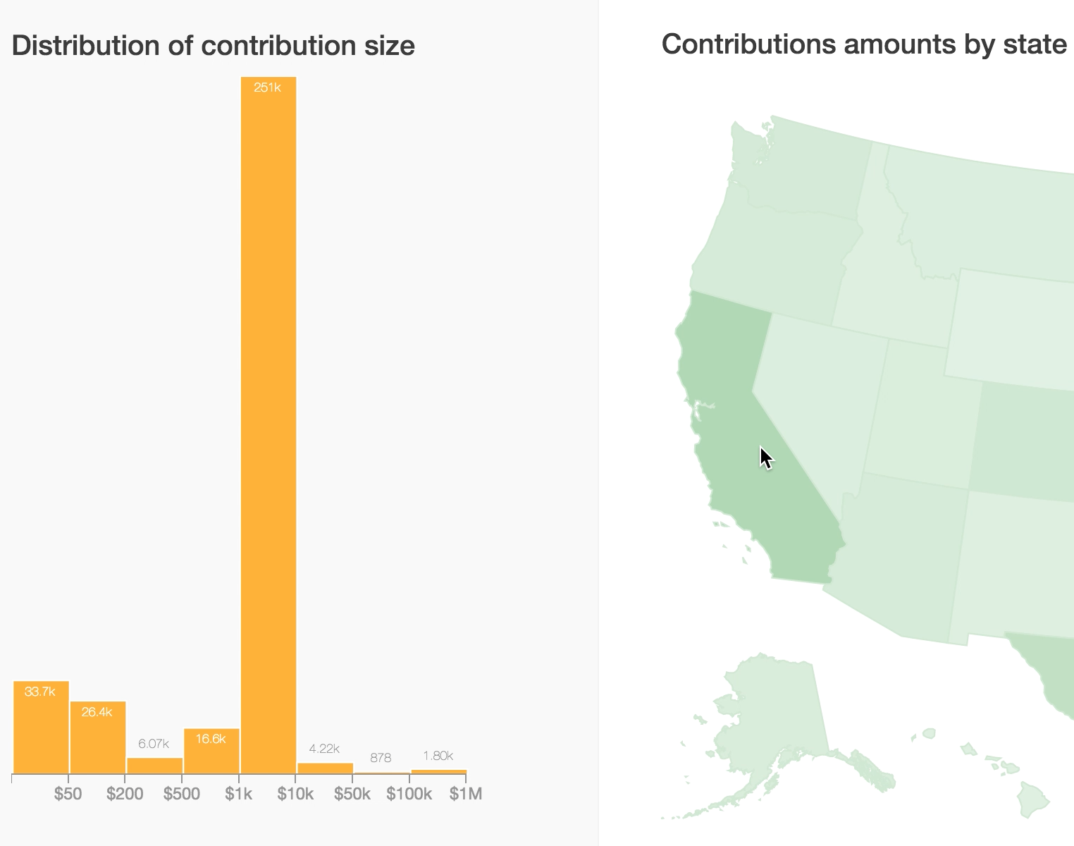 As the user is hovering across the states and sees a total contribution amount that is worthy of inspection, the user should see the transaction histogram display the distribution of contributions that belong to the state highlighted under the cursor. The height of the bars should be with respect to all of the contribution amounts (regardless of state). This will give the user a sense of what fraction of the total contributions came from a particular state.