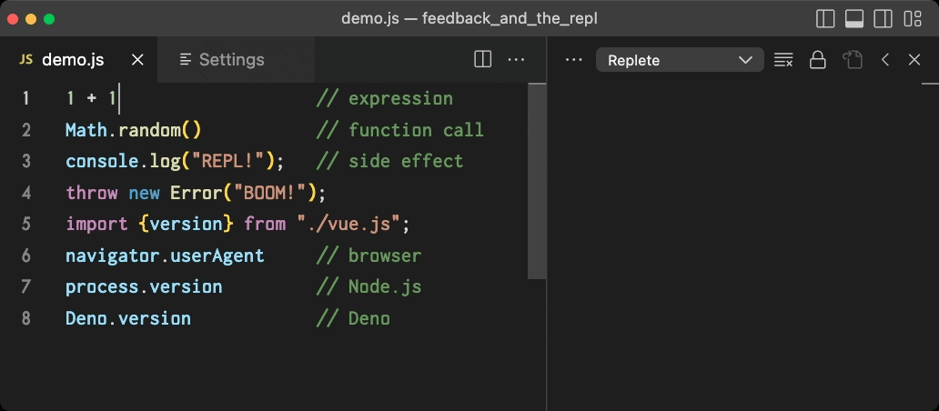 Replete brings interactive programming to JavaScript. It is an evaluator for JavaScript modules, supporting a variety of environments including the browser, Node.js, Deno, Bun, and Txiki.