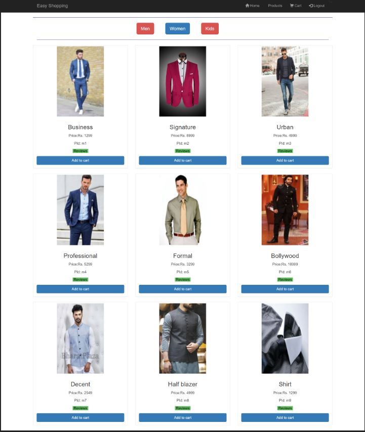 - Customers can select products from different sections ( including men,women and kids which are fetched from database) and can add them to cart.