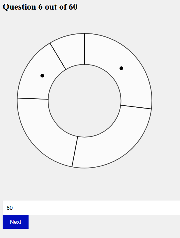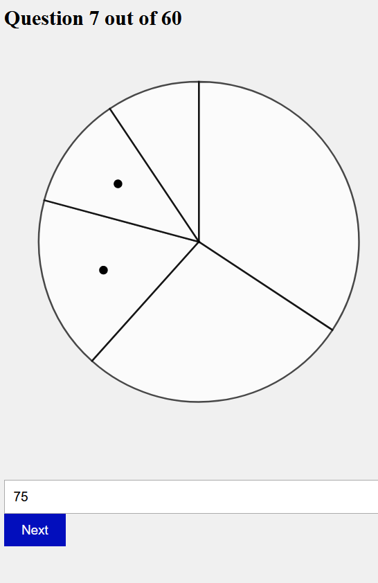 The image above depicts an example of one of our pie charts that were generated. These pie charts had 5 slices, which were randomly generated to have a value between 0 and 100 each. Then two of the slices were randomly selected to be compared. Because we allowed the value to go to 0, there were occasional instances where there would only be 4 slices, and sometimes the circle would end up between two slices to represent that missing slice (and 0% of the larger one).