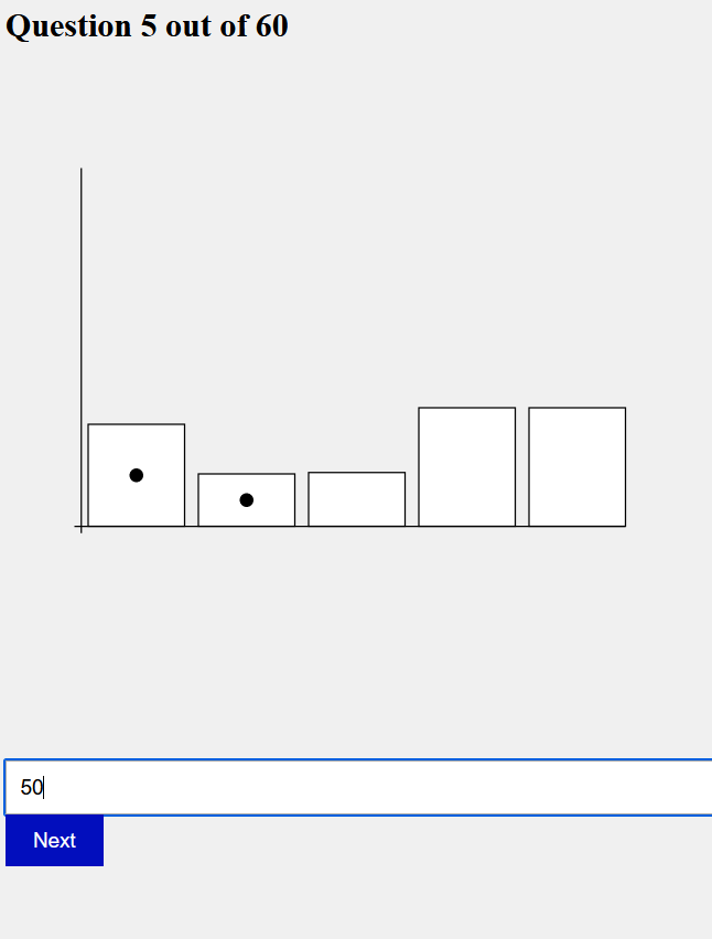 The image above depicts an example of one of our randomized bar charts that were generated. Each of the bar graphs had 5 bars, which were randomly generated to have a value between 0 and 100. Then two of these bars were randomly selected (as seen with the two circles) to be compared.