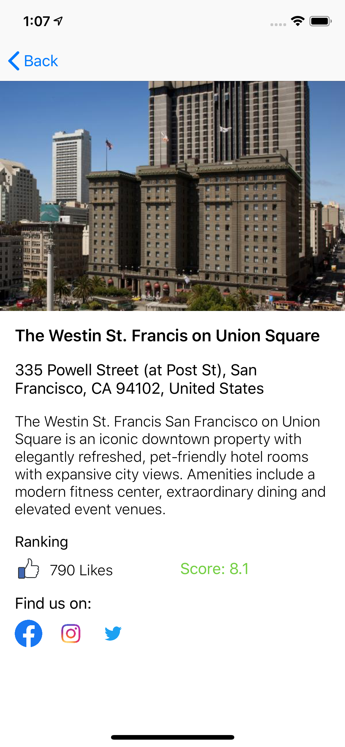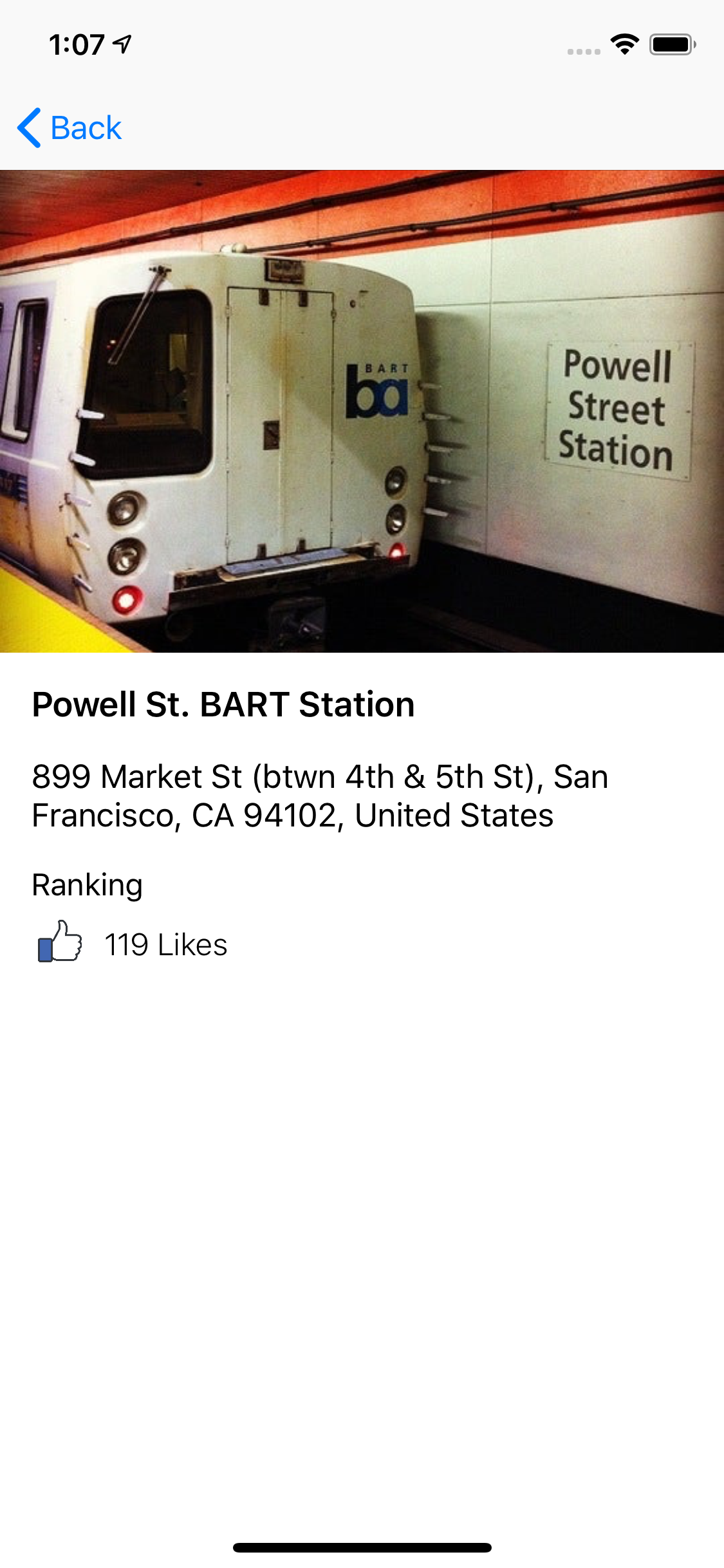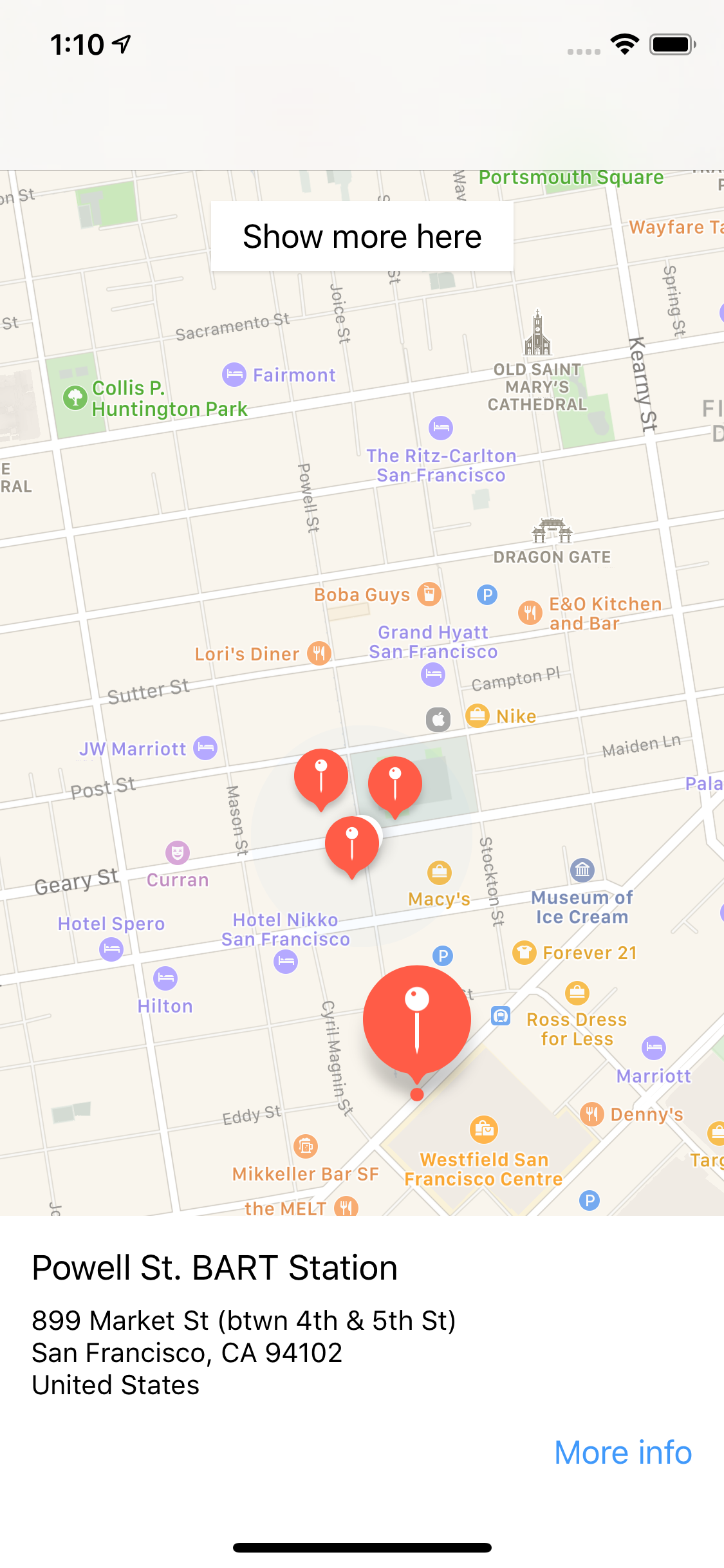The map itself is using MapKit to create the map. And using FourSquareService create the API call to get the data. Tapping on an annotation will show basic information about the place and the posibillity to open a new view with more details. Moving arround will pop a button to show more places in that specific position and will dismiss the current card.