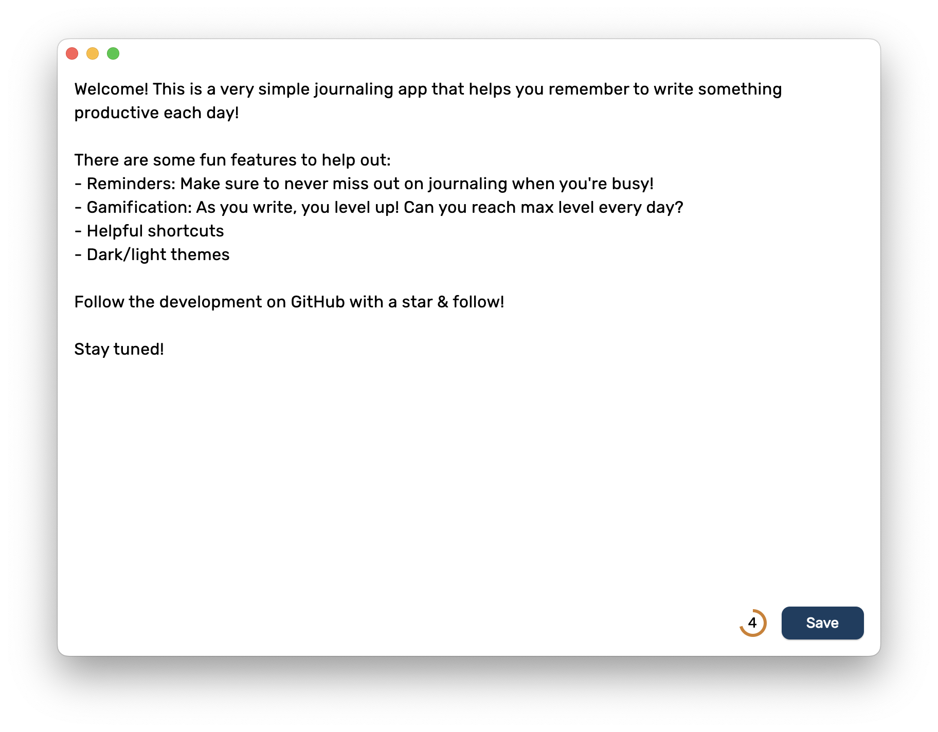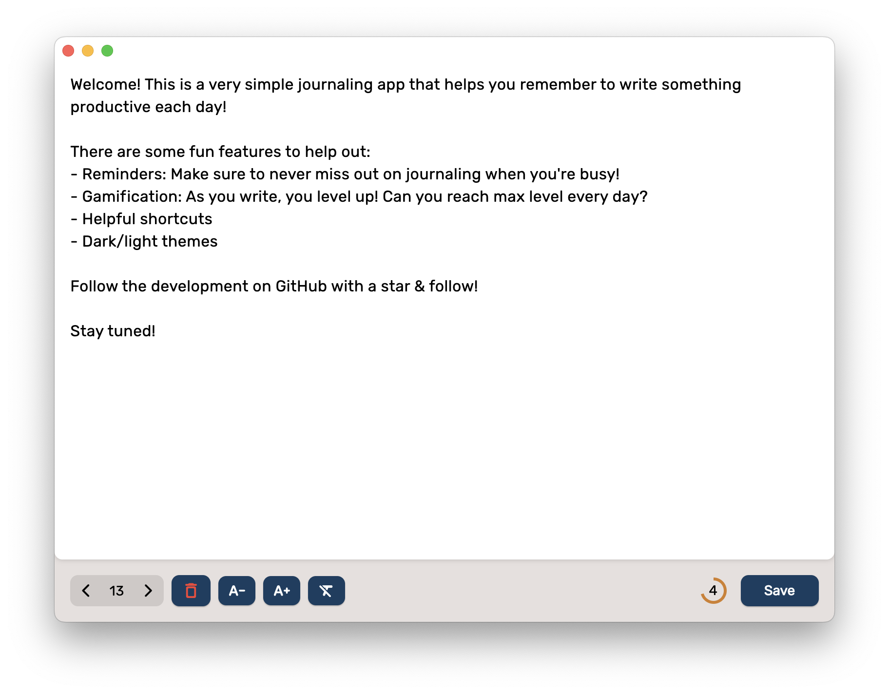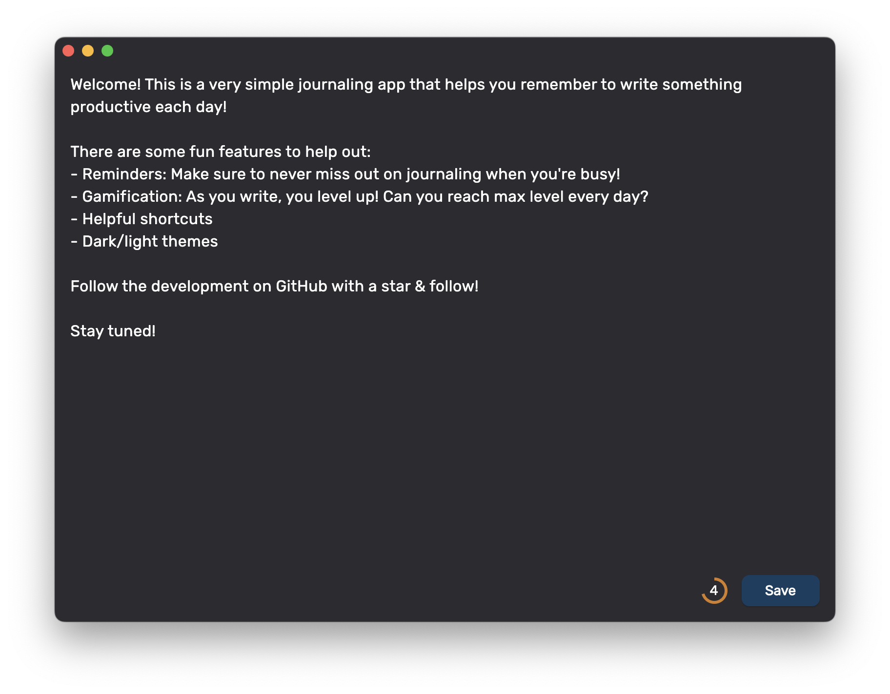 Jernal Things to come See the full backlog here Platforms MacOS support Windows support Linux support Development strategy Start with tests Test pipeline and coverage rule for PR Features Reminders Finalize design (almost?) User Account management File/cloud storage
