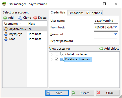 User managerand edit yourdayzhiveminduser to only have full permissions to yourhiveminddatabase and nothing else. It is also a good practice to only allow this user to connect from yourREMOTE_GAME_SERVER_IP. - If you followed all of the previous steps properly, you should now be able to connect to your MySQL service from your game server.