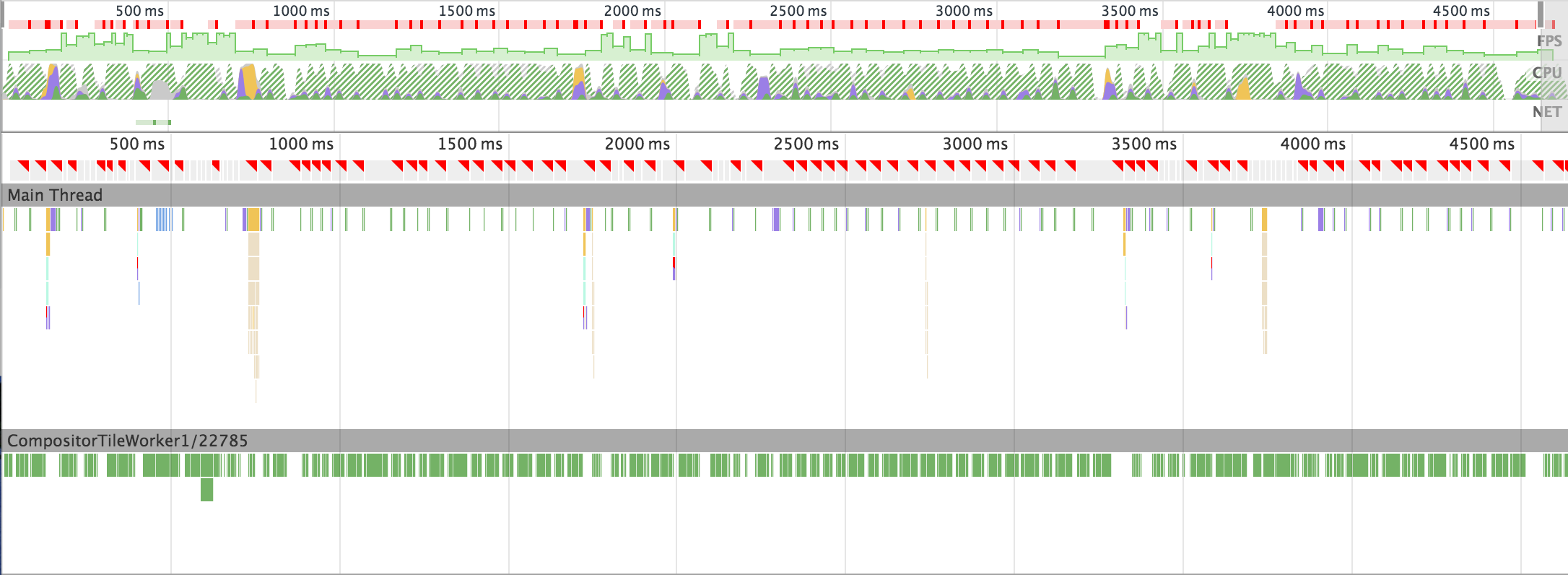 (For these unfamiliar with DevTools Timeline - red marks point out lost frames and the FPS graph should, ideally, be all green and flat.)