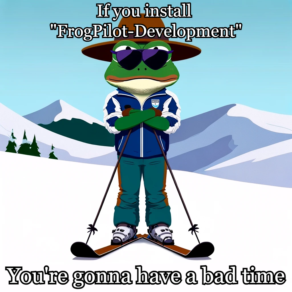 DO NOT install the "FrogPilot-Development" branch. I'm constantly breaking things on there, so unless you don't want to use openpilot, NEVER install it!