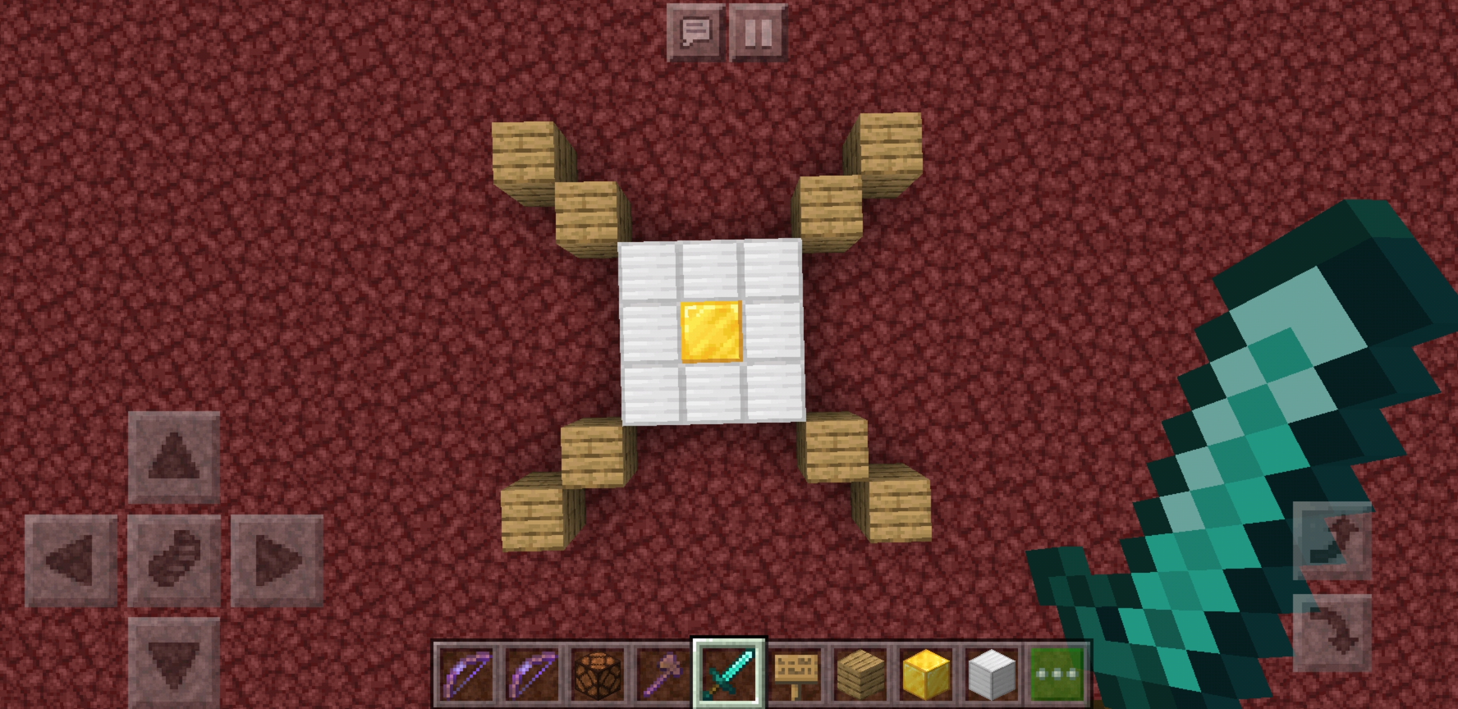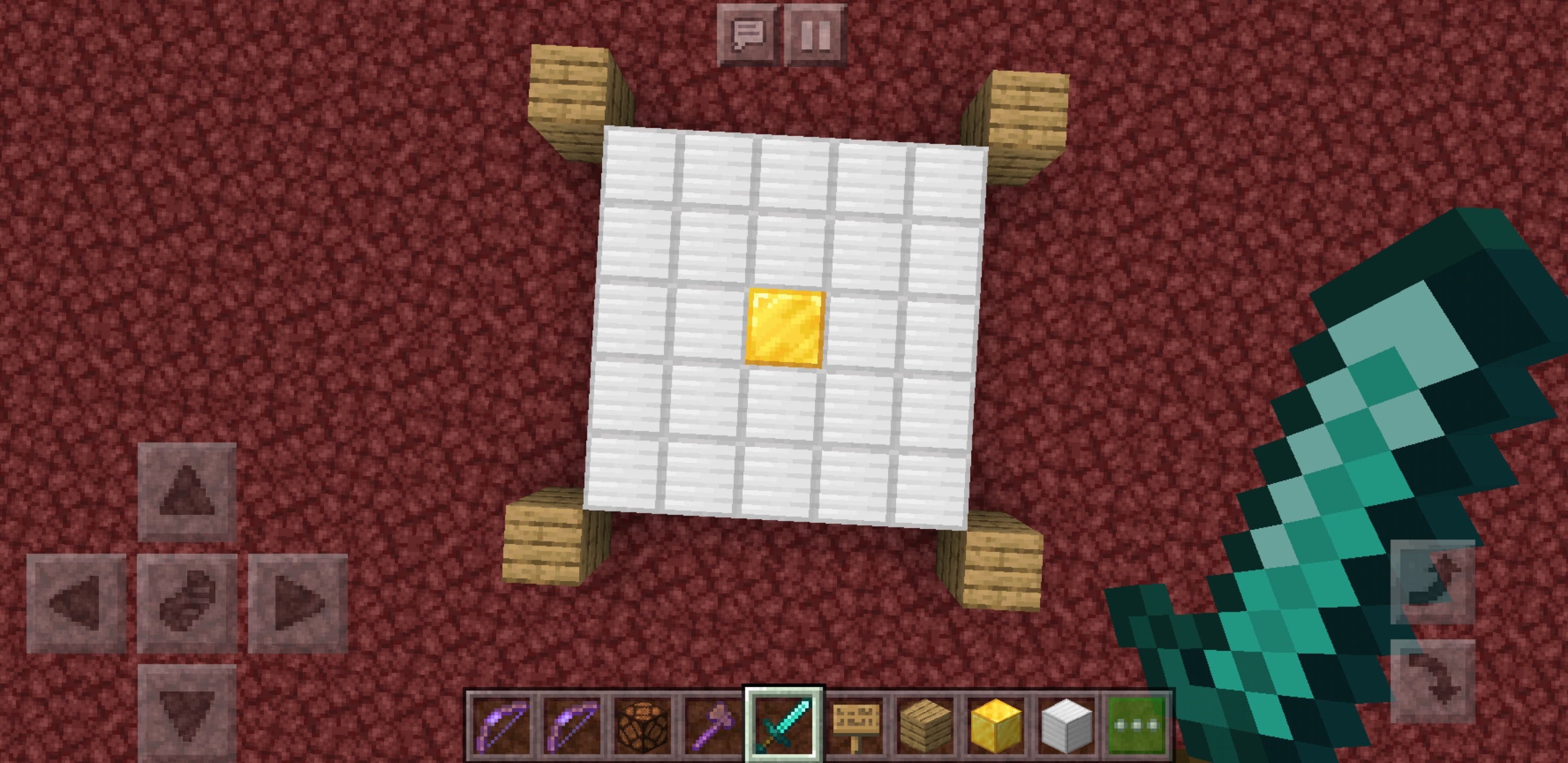上圖為升降機的俯視圖,其中金磚和鐵磚組成3x3升降機,木材表示木牌的有效位置(不能使用紅石燈)